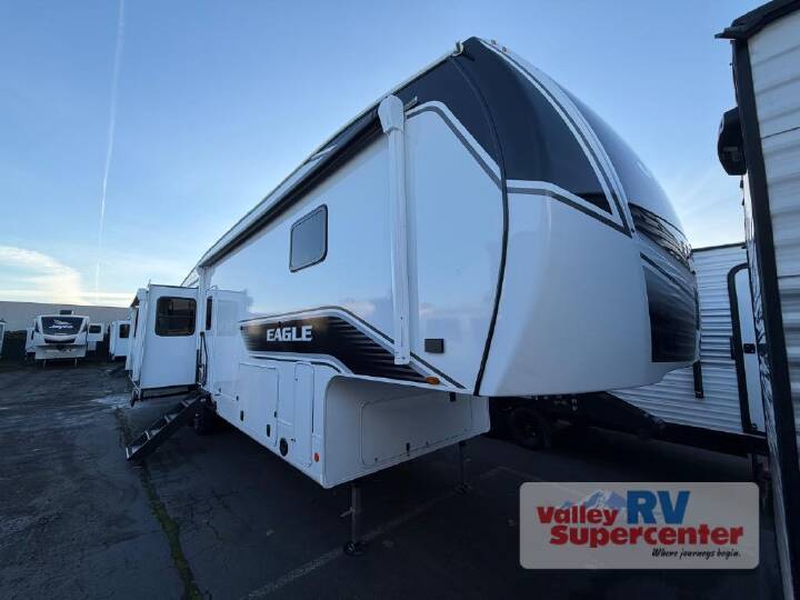 Enjoy time at the campground in this triple slide out fifth wheel! Once you've arrived at the site, you can put out the two power awnings, then stretch your legs on a trail. The fully-equipped kitchen inside will let you make lunch, and there is an exterior sink and griddle option if you like to cook outdoors. There is also a theater sofa with cup holders plus a table and chairs with a bench for cozy seating spaces, and both of these furniture sit across from the entertainment center and fireplace. The spacious front private bedroom in this fifth wheel features a king bed slide out, front shelves with drawers below, a chest with a TV, plus washer and dryer prep if you choose to add these appliances. With any Eagle fifth wheel by Jayco you will appreciate durable construction materials, like the Magnum Truss Roof and the Stronghold VBL laminated walls. The JAYCOMMAND Smart RV system puts you in control of your RV's functions, and the 5 Star Handling Package will provide smooth towing from home to camp. Each model features Climate Shield zero-degree tested weather protection and the industry-exclusive HELIX cooling system that features two 15,000 BTU Whisper Quiet A/C's to keep you comfortable year around. Some of the exterior conveniences you are sure to love are the pass-through storage with Slam-Latch baggage doors and an automotive style front cap with max turn radius. The Eagle fifth wheels are designed to make you feel at home with solid hardwood slide fascia, residential vinyl flooring throughout, 100% no floor vents, and blackout roller shades with reflective side throughout for added privacy and insulation.