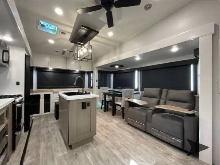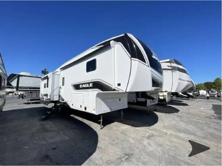Enjoy time at the campground in this triple slide out fifth wheel! Once you've arrived at the site, you can put out the two power awnings, then stretch your legs on a trail. The fully-equipped kitchen inside will let you make lunch, and there is an exterior sink and griddle option if you like to cook outdoors. There is also a theater sofa with cup holders plus a table and chairs with a bench for cozy seating spaces, and both of these furniture sit across from the entertainment center and fireplace. The spacious front private bedroom in this fifth wheel features a king bed slide out, front shelves with drawers below, a chest with a TV, plus washer and dryer prep if you choose to add these appliances. With any Eagle fifth wheel by Jayco you will appreciate durable construction materials, like the Magnum Truss Roof and the Stronghold VBL laminated walls. The JAYCOMMAND Smart RV system puts you in control of your RV's functions, and the 5 Star Handling Package will provide smooth towing from home to camp. Each model features Climate Shield zero-degree tested weather protection and the industry-exclusive HELIX cooling system that features two 15,000 BTU Whisper Quiet A/C's to keep you comfortable year around. Some of the exterior conveniences you are sure to love are the pass-through storage with Slam-Latch baggage doors and an automotive style front cap with max turn radius. The Eagle fifth wheels are designed to make you feel at home with solid hardwood slide fascia, residential vinyl flooring throughout, 100% no floor vents, and blackout roller shades with reflective side throughout for added privacy and insulation.