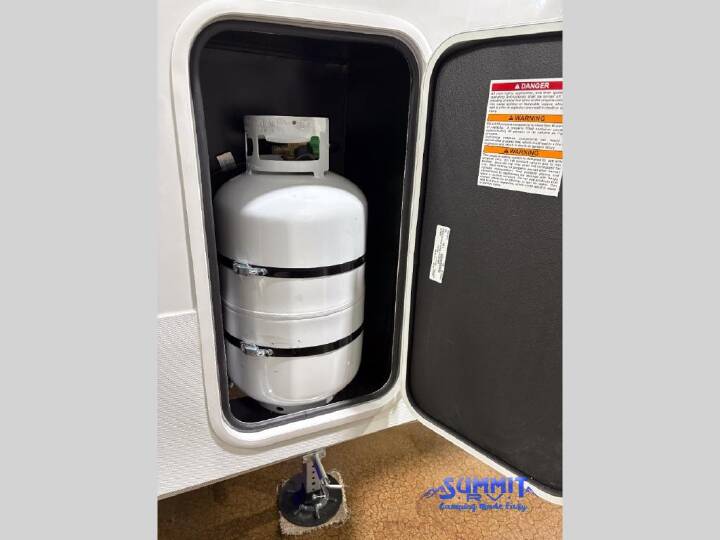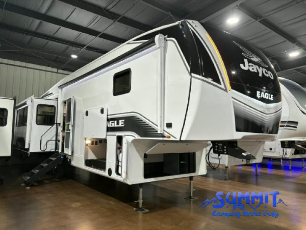It will be so easy to enjoy time in this spacious fifth wheel! The rear living area includes an entertainment center with a fireplace across from the L-shaped sofa for movie nights. There is also a theater sofa with cup holders plus a roll-top dinette with two chairs to dine at. The chef of your group will love the generous counter space in the middle kitchen, and there is a large pantry to keep food stocked. Heading up front, you'll find the spacious bathroom that includes a shower with a seat, and the front private bedroom with a king bed slide out. There is also a chest with a TV, front shelves with drawers, plus washer and dryer prep! With any Eagle fifth wheel by Jayco you will appreciate durable construction materials, like the Magnum Truss Roof and the Stronghold VBL laminated walls. The JAYCOMMAND Smart RV system puts you in control of your RV's functions, and the 5 Star Handling Package will provide smooth towing from home to camp. Each model features Climate Shield zero-degree tested weather protection and the industry-exclusive HELIX cooling system that features two 15,000 BTU Whisper Quiet A/C's to keep you comfortable year around. Some of the exterior conveniences you are sure to love are the pass-through storage with Slam-Latch baggage doors and an automotive style front cap with max turn radius. The Eagle fifth wheels are designed to make you feel at home with solid hardwood slide fascia, residential vinyl flooring throughout, 100% no floor vents, and blackout roller shades with reflective side throughout for added privacy and insulation. Packages:
