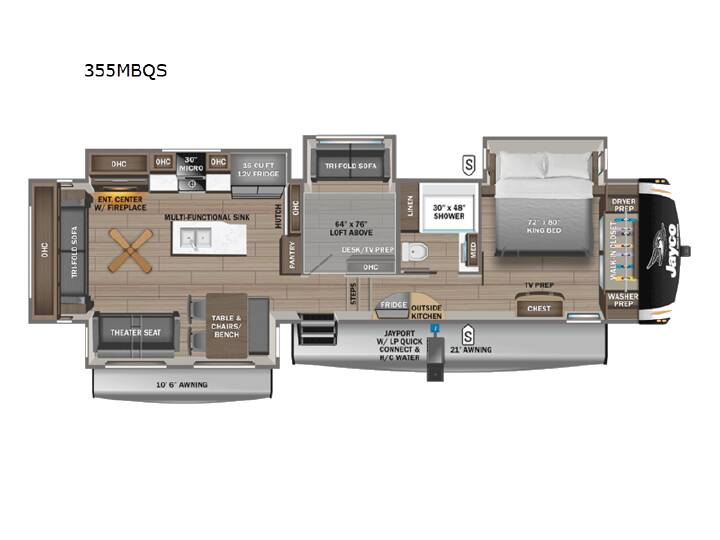 This fifth wheel with four slides is one your whole crew will love! There is a middle bedroom/den with a tri-fold sofa and a desk, allowing this room to become an office if you need it. The loft above this room will be a big hit with the little ones, and the full bath is centrally located so everyone can use it easily. You will have the front private bedroom all to yourselves with a king bed slide out, a chest with TV prep, plus washer and dryer prep in the walk-in closet. The main living area includes everything you need to relax in comfort, like the theater seats, tri-fold sofa, and entertainment center with a fireplace. The chef will enjoy the extra counter space provided by the kitchen island, and there is plenty of storage with the pantry, hutch, and 16 cu. ft. 12V refrigerator. This model even has an outside kitchen, two power awnings, and outside storage for all your gear! With any Eagle fifth wheel by Jayco you will appreciate durable construction materials, like the Magnum Truss Roof and the Stronghold VBL laminated walls. The JAYCOMMAND Smart RV system puts you in control of your RV's functions, and the 5 Star Handling Package will provide smooth towing from home to camp. Each model features Climate Shield zero-degree tested weather protection and the industry-exclusive HELIX cooling system that features two 15,000 BTU Whisper Quiet A/C's to keep you comfortable year around. Some of the exterior conveniences you are sure to love are the pass-through storage with Slam-Latch baggage doors and an automotive style front cap with max turn radius. The Eagle fifth wheels are designed to make you feel at home with solid hardwood slide fascia, residential vinyl flooring throughout, 100% no floor vents, and blackout roller shades with reflective side throughout for added privacy and insulation.