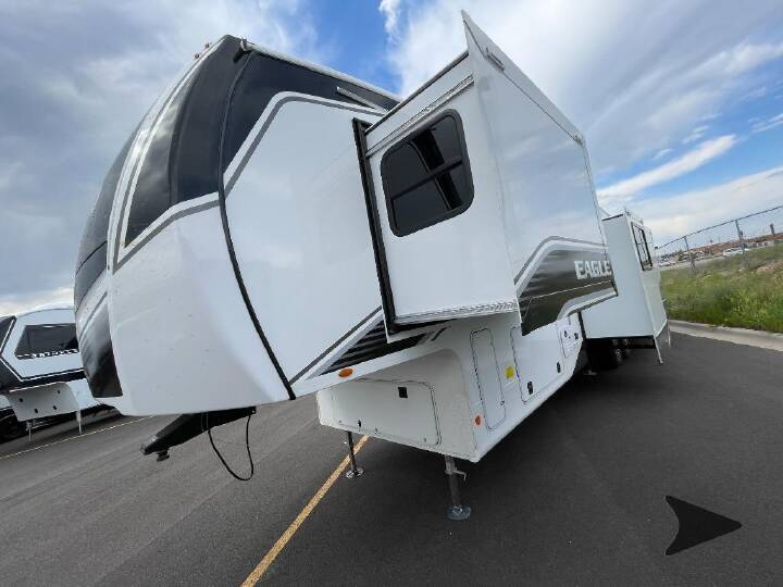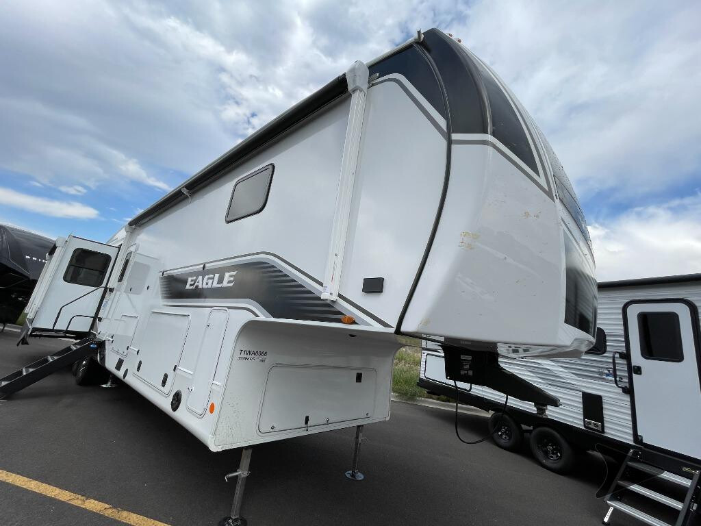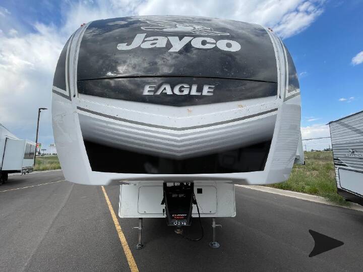 This fifth wheel with four slides is one your whole crew will love! There is a middle bedroom/den with a tri-fold sofa and a desk, allowing this room to become an office if you need it. The loft above this room will be a big hit with the little ones, and the full bath is centrally located so everyone can use it easily. You will have the front private bedroom all to yourselves with a king bed slide out, a chest with TV prep, plus washer and dryer prep in the walk-in closet. The main living area includes everything you need to relax in comfort, like the theater seats, tri-fold sofa, and entertainment center with a fireplace. The chef will enjoy the extra counter space provided by the kitchen island, and there is plenty of storage with the pantry, hutch, and 16 cu. ft. 12V refrigerator. This model even has an outside kitchen, two power awnings, and outside storage for all your gear! With any Eagle fifth wheel by Jayco you will appreciate durable construction materials, like the Magnum Truss Roof and the Stronghold VBL laminated walls. The JAYCOMMAND Smart RV system puts you in control of your RV's functions, and the 5 Star Handling Package will provide smooth towing from home to camp. Each model features Climate Shield zero-degree tested weather protection and the industry-exclusive HELIX cooling system that features two 15,000 BTU Whisper Quiet A/C's to keep you comfortable year around. Some of the exterior conveniences you are sure to love are the pass-through storage with Slam-Latch baggage doors and an automotive style front cap with max turn radius. The Eagle fifth wheels are designed to make you feel at home with solid hardwood slide fascia, residential vinyl flooring throughout, 100% no floor vents, and blackout roller shades with reflective side throughout for added privacy and insulation.