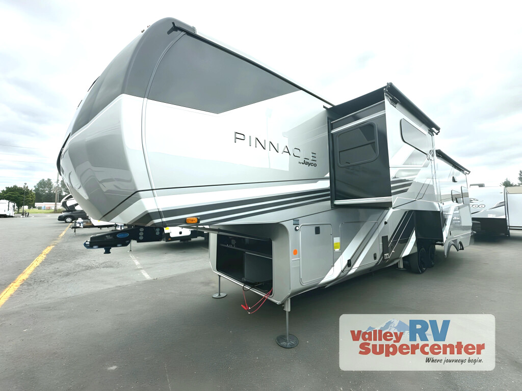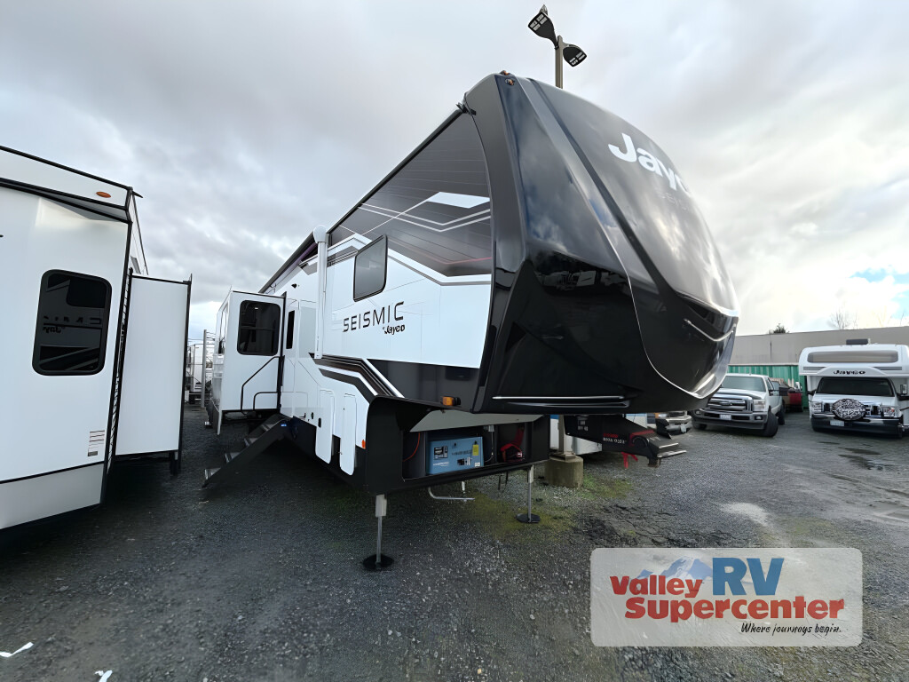 This fifth wheel with four slides is one your whole crew will love! There is a middle bedroom/den with a tri-fold sofa and a desk, allowing this room to become an office if you need it. The loft above this room will be a big hit with the little ones, and the full bath is centrally located so everyone can use it easily. You will have the front private bedroom all to yourselves with a king bed slide out, a chest with TV prep, plus washer and dryer prep in the walk-in closet. The main living area includes everything you need to relax in comfort, like the theater seats, tri-fold sofa, and entertainment center with a fireplace. The chef will enjoy the extra counter space provided by the kitchen island, and there is plenty of storage with the pantry, hutch, and 16 cu. ft. 12V refrigerator. This model even has an outside kitchen, two power awnings, and outside storage for all your gear! With any Eagle fifth wheel by Jayco you will appreciate durable construction materials, like the Magnum Truss Roof and the Stronghold VBL laminated walls. The JAYCOMMAND Smart RV system puts you in control of your RV's functions, and the 5 Star Handling Package will provide smooth towing from home to camp. Each model features Climate Shield zero-degree tested weather protection and the industry-exclusive HELIX cooling system that features two 15,000 BTU Whisper Quiet A/C's to keep you comfortable year around. Some of the exterior conveniences you are sure to love are the pass-through storage with Slam-Latch baggage doors and an automotive style front cap with max turn radius. The Eagle fifth wheels are designed to make you feel at home with solid hardwood slide fascia, residential vinyl flooring throughout, 100% no floor vents, and blackout roller shades with reflective side throughout for added privacy and insulation.