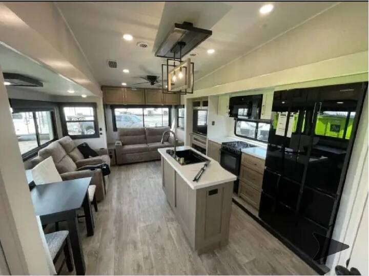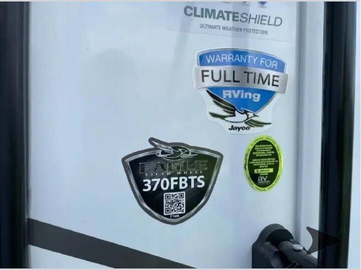 Enjoy a private bedroom suite in this fifth wheel! The king bed is positioned in a slide out for maximum room, and a sliding door leads to the front bath which is full of luxurious features. Enjoy a 30" x 60" shower. There's also a walk-in front closet which has washer and dryer prep if you want to add those appliances. You'll love the living area with its theater seats, tri-fold sofa, ceiling fan, and entertainment center with fireplace. The kitchen has a three burner cooktop, center island with a multi-functional sink, 30" microwave oven over the range, and a 16 cu. ft. 12 volt refrigerator - perfect for cooking up great meals. And the additional overhead storage over the half bath will be perfect for luggage! With any Eagle fifth wheel by Jayco you will appreciate durable construction materials, like the Magnum Truss Roof and the Stronghold VBL laminated walls. The JAYCOMMAND Smart RV system puts you in control of your RV's functions, and the 5 Star Handling Package will provide smooth towing from home to camp. Each model features Climate Shield zero-degree tested weather protection and the industry-exclusive HELIX cooling system that features two 15,000 BTU Whisper Quiet A/C's to keep you comfortable year around. Some of the exterior conveniences you are sure to love are the pass-through storage with Slam-Latch baggage doors and an automotive style front cap with max turn radius. The Eagle fifth wheels are designed to make you feel at home with solid hardwood slide fascia, residential vinyl flooring throughout, 100% no floor vents, and blackout roller shades with reflective side throughout for added privacy and insulation.