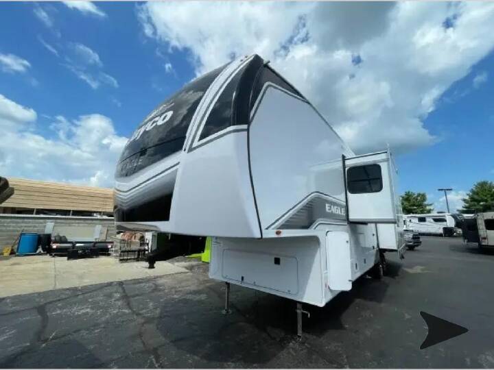 Enjoy a private bedroom suite in this fifth wheel! The king bed is positioned in a slide out for maximum room, and a sliding door leads to the front bath which is full of luxurious features. Enjoy a 30" x 60" shower. There's also a walk-in front closet which has washer and dryer prep if you want to add those appliances. You'll love the living area with its theater seats, tri-fold sofa, ceiling fan, and entertainment center with fireplace. The kitchen has a three burner cooktop, center island with a multi-functional sink, 30" microwave oven over the range, and a 16 cu. ft. 12 volt refrigerator - perfect for cooking up great meals. And the additional overhead storage over the half bath will be perfect for luggage! With any Eagle fifth wheel by Jayco you will appreciate durable construction materials, like the Magnum Truss Roof and the Stronghold VBL laminated walls. The JAYCOMMAND Smart RV system puts you in control of your RV's functions, and the 5 Star Handling Package will provide smooth towing from home to camp. Each model features Climate Shield zero-degree tested weather protection and the industry-exclusive HELIX cooling system that features two 15,000 BTU Whisper Quiet A/C's to keep you comfortable year around. Some of the exterior conveniences you are sure to love are the pass-through storage with Slam-Latch baggage doors and an automotive style front cap with max turn radius. The Eagle fifth wheels are designed to make you feel at home with solid hardwood slide fascia, residential vinyl flooring throughout, 100% no floor vents, and blackout roller shades with reflective side throughout for added privacy and insulation.