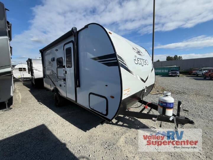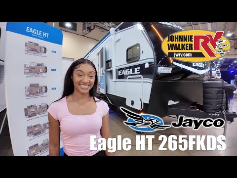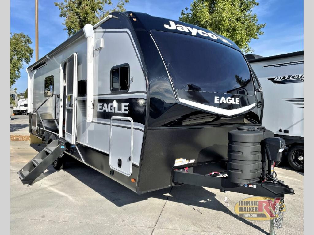 This is the perfect travel trailer for the couple who loves comfort at the campground! The front kitchen features ample counter space, including a bartop with barstool chairs and all the appliances to make your best meals. If you'd rather be outside, there is an outdoor kitchen and a power awning where you can spend your evenings. The master bedroom includes an Olympic-size queen bed slide out, a dresser, plus a wardrobe with washer and dryer prep. And don't overlook the full rear bath, complete with a 30" x 48" shower, a linen closet, and dual bath sinks so you both can get ready at the same time! With any Eagle HT fifth wheel or travel trailer by Jayco you will enjoy a smooth drive thanks to the 4 Star Handling Package and MORryde CRE-3000 rubberized suspension. The Customer Value Package includes amenities that are sure to make camping easier than ever, like the 60K on-demand water heater, Keyed-Alike lock system, 15,000 BTU "Whisper Quiet" A/C, and more. Handcrafted door/drawer fronts will make your space feel more like home, along with residential vinyl flooring throughout, GE appliances, and blackout roller shades with reflective side throughout to keep the sun out when you want to sleep in. Each model also includes a NuVo H2O water treatment system with filters included, interior and exterior "Blue Sync" audio connect with MB Quart Sound for your TV and phone, and 100% no floor vents for added comfort and convenience! PRE-DELIVERY INSPECTION; CUSTOMER SCHOOLING; TRAILER PAC VOUCHER; FILL LPG; INSTALL 2 BATTERIES; EQUIPMENT/OPTIONS MAY VARY WITH MODEL CHANGE; 2 YEAR MANUFACTURER LIMITED WARRANTY; 3 YEAR MANUFACTURER LIMITED STRUCTURAL WARRANTY; CUSTOMER VALUE PACKAGE; 15K WHISPER QUIET AIR; 2ND AIR PREP; 40" 4K ULTRA LED HD SMART TV IN LR; 50AMP SERVICE W/DUAL AC DUCTS; 60K ON DEMAND TANKLESS WATER HEATER; CUSTOM MACHINED ALUMINUM RIMS; ELECTRIC PATIO AWNING; HIDDEN HINGES ON CABINET DOORS; INTERIOR BLUE SYNC AUDIO CONNECT W/MB QUART SOUND; KEYED ALIKE LOCK SYSTEM; MORRYDE STEP ABOVE ENTRANCE STEP; RAINPROOF BATHROOM POWER VENT; 2" RECEIVER (FOR ACCESSORIES); WINEGARD AIR 360 ANTENNA; INVERTER PREWIRE (SELECT OUTLETS); OVERLANDER I SOLAR PACKAGE; LUXURY PACKAGE; BLACK-OUT ROLLER SHADES W/REFLECTIVE SIDE T/O; 10CU FT 12V REFRIGERATOR W/BLACK GLASS FRONT; JAYPORT 2" MOUNT FOR OUTSIDE ACCESSORIES; RESIDENTIAL STYLE GLASS SHOWER DOOR; WASHER DRYER PREP (SELECT MODELS); 30" OTR BLACK/SS MICROWAVE; GE 21" BLACK/SS RANGE W/EDGE TO EDGE GRATES; MULTI FUNCTION ALL IN ONE BLACK SS KITCHEN SINK; RESIDENTIAL OLYMPIC 66" X 80" MATTRESS; M