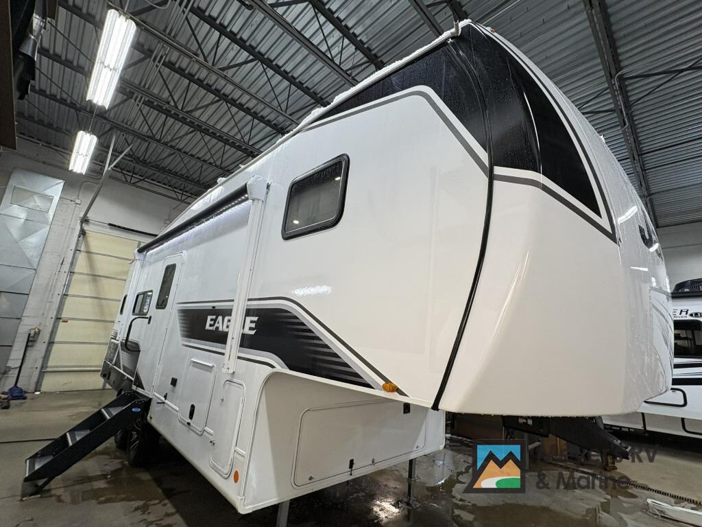 Camping just got a whole lot sweeter in this fifth wheel with double slides, a rear kitchen, and sleeping space for five to six. You'll love waking up each morning in the front private bedroom that includes a queen bed, dual nightstands and overhead cabinets, plus a wardrobe and dresser slide. Your guests who slept on the tri-fold sofa and booth dinette can convert these back to seating space in the morning, and breakfast can be made in the rear kitchen. Here, you'll find ample counter space, a microwave and range, plus a pantry and 12V refrigerator for food storage. Outside, gear can be stored in the pass-thru storage area, and you're sure to enjoy the 16' power awning with LED Lights! With any Eagle SLE fifth wheel by Jayco, you will enjoy a lighter tow weight, high-end finishes, and the same quality construction you've come to expect from Jayco! There is an Alpha Ply TPO roof membrane, a fully enclosed and heated underbelly, plus Stronghold VBL walls for added durability. There is also a rear 2" towing receiver outside, along with metal slam latch baggage doors, MORryde Step Above entry steps, and a Winegard Air 360 antenna with router prep if you want to stay connected as you camp. Once inside you'll enjoy the handcrafted door/drawer fronts, shower skylight, and residential vinyl flooring throughout with no carpet for an easier clean. The on-demand water heater, 30K BTU furnace, and 15K BTU "Whisper Quiet" A/C will ensure your comfort, and the Overland 1 Solar Package will provide off-grid capabilities! CUSTOMER VALUE PACKAGE DISCOUNT; DISCOUNT; CUSTOMER VALUE PACKAGE; 2ND 15,000 AC IN BEDROOM; VSP DISCOUNT; THEATER SEATING SOFA