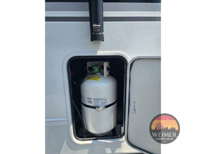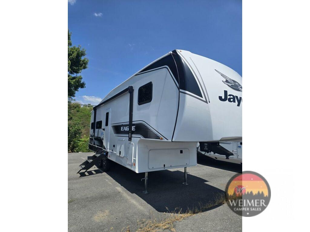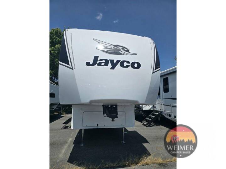 Camping just got a whole lot sweeter in this fifth wheel with double slides, a rear kitchen, and sleeping space for five to six. You'll love waking up each morning in the front private bedroom that includes a queen bed, dual nightstands and overhead cabinets, plus a wardrobe and dresser slide. Your guests who slept on the tri-fold sofa and booth dinette can convert these back to seating space in the morning, and breakfast can be made in the rear kitchen. Here, you'll find ample counter space, a microwave and range, plus a pantry and 12V refrigerator for food storage. Outside, gear can be stored in the pass-thru storage area, and you're sure to enjoy the 16' power awning with LED Lights! With any Eagle SLE fifth wheel by Jayco, you will enjoy a lighter tow weight, high-end finishes, and the same quality construction you've come to expect from Jayco! There is an Alpha Ply TPO roof membrane, a fully enclosed and heated underbelly, plus Stronghold VBL walls for added durability. There is also a rear 2" towing receiver outside, along with metal slam latch baggage doors, MORryde Step Above entry steps, and a Winegard Air 360 antenna with router prep if you want to stay connected as you camp. Once inside you'll enjoy the handcrafted and glazed door/drawer fronts, blackout pleated shades throughout, and residential vinyl flooring throughout with no carpet for an easier clean. The on-demand water heater, 30K BTU furnace, and 15K BTU "Whisper Quiet" A/C will ensure your comfort year around, and the optional Overland 1 Solar Package can be added if you need off-grid capabilities!