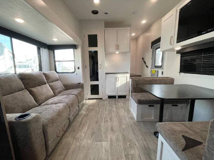 Camping just got a whole lot sweeter in this fifth wheel with double slides, a rear kitchen, and sleeping space for five to six. You'll love waking up each morning in the front private bedroom that includes a queen bed, dual nightstands and overhead cabinets, plus a wardrobe and dresser slide. Your guests who slept on the tri-fold sofa and booth dinette can convert these back to seating space in the morning, and breakfast can be made in the rear kitchen. Here, you'll find ample counter space, a microwave and range, plus a pantry and 12V refrigerator for food storage. Outside, gear can be stored in the pass-thru storage area, and you're sure to enjoy the 16' power awning with LED Lights! With any Eagle SLE fifth wheel by Jayco, you will enjoy a lighter tow weight, high-end finishes, and the same quality construction you've come to expect from Jayco! There is an Alpha Ply TPO roof membrane, a fully enclosed and heated underbelly, plus Stronghold VBL walls for added durability. There is also a rear 2" towing receiver outside, along with metal slam latch baggage doors, MORryde Step Above entry steps, and a Winegard Air 360 antenna with router prep if you want to stay connected as you camp. Once inside you'll enjoy the handcrafted door/drawer fronts, shower skylight, and residential vinyl flooring throughout with no carpet for an easier clean. The on-demand water heater, 30K BTU furnace, and 15K BTU "Whisper Quiet" A/C will ensure your comfort, and the Overland 1 Solar Package will provide off-grid capabilities! Bish s RV - Meridian, Idaho has a huge selection of Travel Trailers, Fifth Wheels, Pop Up Campers, Truck Camper s, Toy Haulers, Class A Motorhomes, Class B Camper Vans, and Class C Motorhomes. All these RVs are priced to sell. Be sure to ask about our Purchase with Confidence Guarantee to ensure you are receiving the best RV buying experience in Meridian and surrounding areas like Boise, Nampa, & Caldwell. Affordable prices on all new and used RVs only at Bish s RV of Meridian.