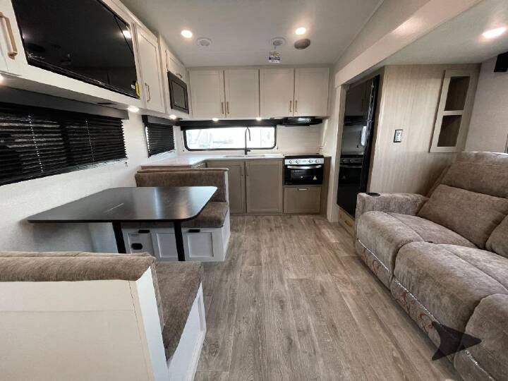 Camping just got a whole lot sweeter in this fifth wheel with double slides, a rear kitchen, and sleeping space for five to six. You'll love waking up each morning in the front private bedroom that includes a queen bed, dual nightstands and overhead cabinets, plus a wardrobe and dresser slide. Your guests who slept on the tri-fold sofa and booth dinette can convert these back to seating space in the morning, and breakfast can be made in the rear kitchen. Here, you'll find ample counter space, a microwave and range, plus a pantry and 12V refrigerator for food storage. Outside, gear can be stored in the pass-thru storage area, and you're sure to enjoy the 16' power awning with LED Lights! With any Eagle SLE fifth wheel by Jayco, you will enjoy a lighter tow weight, high-end finishes, and the same quality construction you've come to expect from Jayco! There is an Alpha Ply TPO roof membrane, a fully enclosed and heated underbelly, plus Stronghold VBL walls for added durability. There is also a rear 2" towing receiver outside, along with metal slam latch baggage doors, MORryde Step Above entry steps, and a Winegard Air 360 antenna with router prep if you want to stay connected as you camp. Once inside you'll enjoy the handcrafted door/drawer fronts, shower skylight, and residential vinyl flooring throughout with no carpet for an easier clean. The on-demand water heater, 30K BTU furnace, and 15K BTU "Whisper Quiet" A/C will ensure your comfort, and the Overland 1 Solar Package will provide off-grid capabilities! Bish s RV - Meridian, Idaho has a huge selection of Travel Trailers, Fifth Wheels, Pop Up Campers, Truck Camper s, Toy Haulers, Class A Motorhomes, Class B Camper Vans, and Class C Motorhomes. All these RVs are priced to sell. Be sure to ask about our Purchase with Confidence Guarantee to ensure you are receiving the best RV buying experience in Meridian and surrounding areas like Boise, Nampa, & Caldwell. Affordable prices on all new and used RVs only at Bish s RV of Meridian.