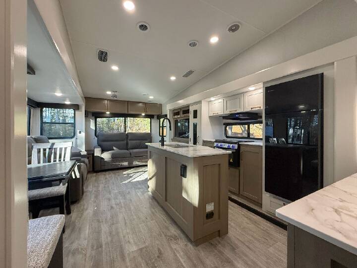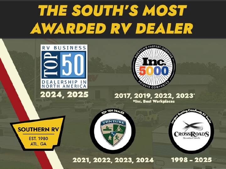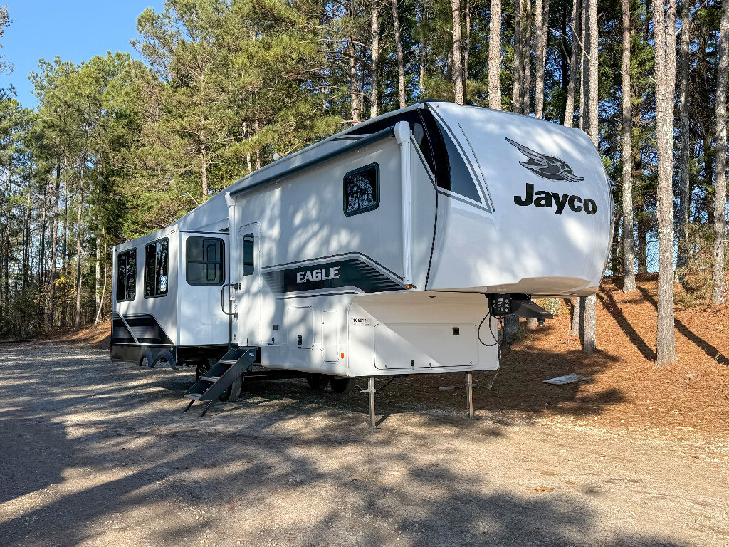 You can't go wrong when camping in this spacious fifth wheel! There are dual opposing slides in the living room, giving your crew plenty of space to prep dinner on the kitchen island, relax on the theater sofa, or dine at the booth dinette. There is also a rear tri-fold sofa where your guests can sleep! An entertainment center with a fireplace will make this space feel even more like home, and there are plenty of storage spaces for all your belongings. The full bath towards the front will let you freshen up each day, and the front private bedroom with a queen bed is sure to bring comfort. There are also dual nightstands, overhead cabinets, plus a wardrobe and dresser slide out, so everything has a place! With any Eagle SLE fifth wheel by Jayco, you will enjoy a lighter tow weight, high-end finishes, and the same quality construction you've come to expect from Jayco! There is an Alpha Ply TPO roof membrane, a fully enclosed and heated underbelly, plus Stronghold VBL walls for added durability. There is also a rear 2" towing receiver outside, along with metal slam latch baggage doors, MORryde Step Above entry steps, and a Winegard Air 360 antenna with router prep if you want to stay connected as you camp. Once inside you'll enjoy the handcrafted door/drawer fronts, shower skylight, and residential vinyl flooring throughout with no carpet for an easier clean. The on-demand water heater, 30K BTU furnace, and 15K BTU "Whisper Quiet" A/C will ensure your comfort, and the Overland 1 Solar Package will provide off-grid capabilities! With over 45 years as a family run business we carry great new products from brands like Jayco, Forest River, Venture RV and DRV, and Crossroads and Thor Motor Coach. Southern RV also features certified pre-owned RV's from companies like Keystone, Brinkley, Heartland, Airstream and Alliance,Tiffin and Winnebago. Come into our Cumming or Mcdonough locations and take advantage of the exceptional customer experience and marvelous pricing that has positioned Southern RV as one of the most awarded RV Dealers in the America with two RV Business Top 50 Dealer awards, three Inc. 5000 awards, as well as a Top Ten Venture RV Dealer for four years in a row. *Advertised sale price may be inclusive of a Finance Concession, please consult a Southern RV sales associate for details.