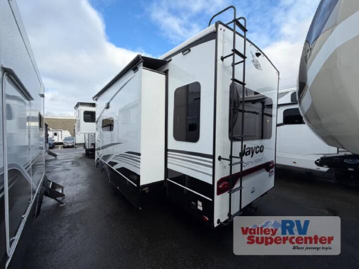 Whether you want to live in this fifth wheel or travel for long periods at a time, you will enjoy the spacious main living and kitchen area with dual slide outs as well as the bedroom with a slide out king bed. You will also find a walk-in closet with hamper and prepped space for a washer/dryer option, and a flip-top dresser with 32" TV. Easily get cleaned up in the full bathroom which also has linen storage. The cook will have a residential refrigerator to store all the cold items and beverages, a kitchen island, a pantry and a residential 24" stove. The 50" Smart LED HDTV with fully digital HDMI output and home entertainment system with subwoofer and fireplace below will provide a cozy place to watch your shows while relaxing on the theater seats, the tri-fold sofa, or the roll-top dinette table. With any North Point fifth wheel by Jayco you begin with a strong foundation with a custom frame, designed and sized specifically to best support each unit. Constructed with Stronghold VBL aluminum framed, vacuum bond laminated walls and the Magnum Truss XL6 roof system with an Alpha roof membrane system, which is the strongest tested roof in the industry. The 5-Star Handling package is included with Uniroyal tires, a MORryde rubber pin box, Dexter axles with Nev-R-Adjust brakes, MORryde CRE-3000 rubberized suspension and wet bolt fasteners and bronze bushings. The interior has handcrafted hardwood glazed doors and drawers, vinyl flooring throughout, an integrated under-mount sink in the main bathroom, plus so much more you just have to see one to believe it all!