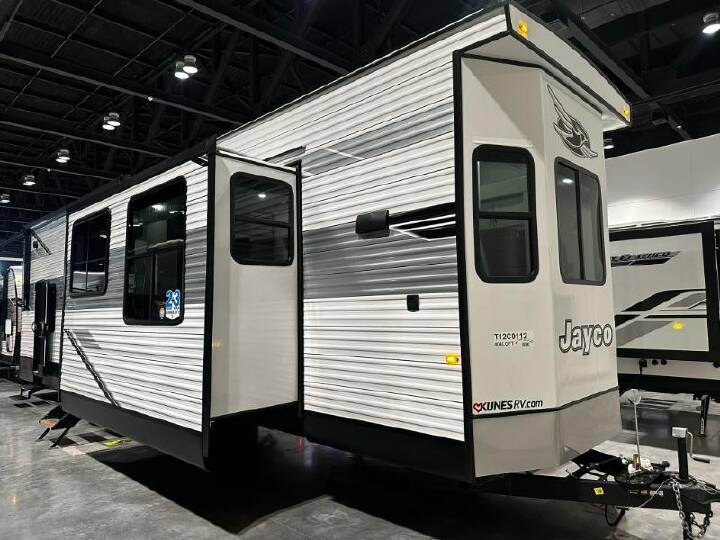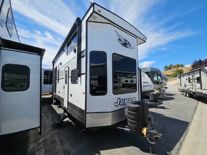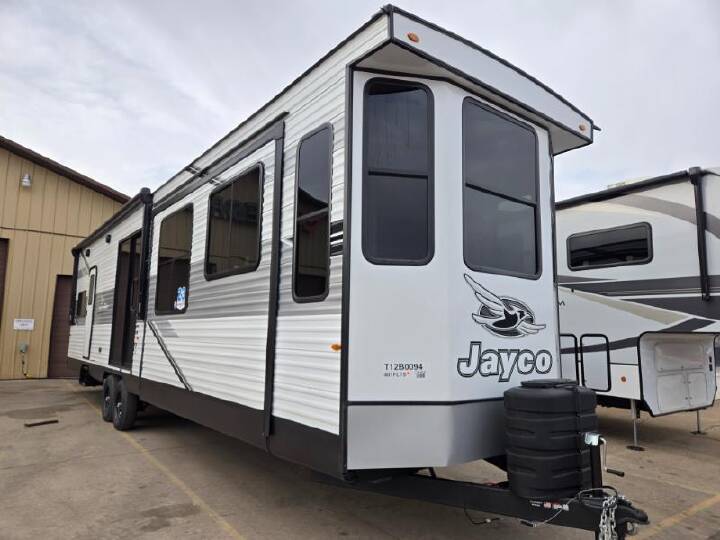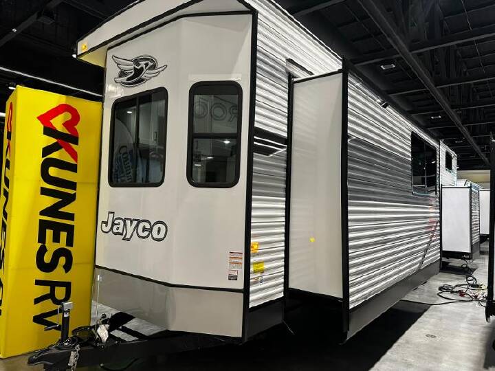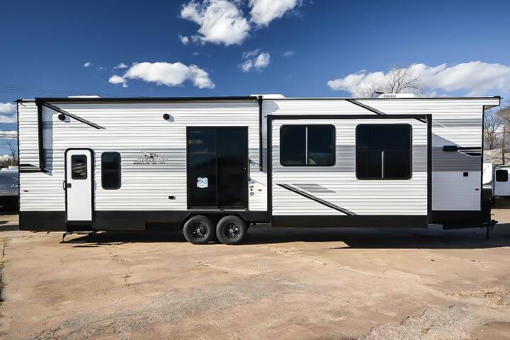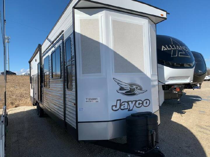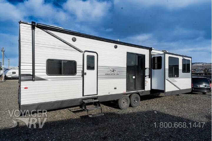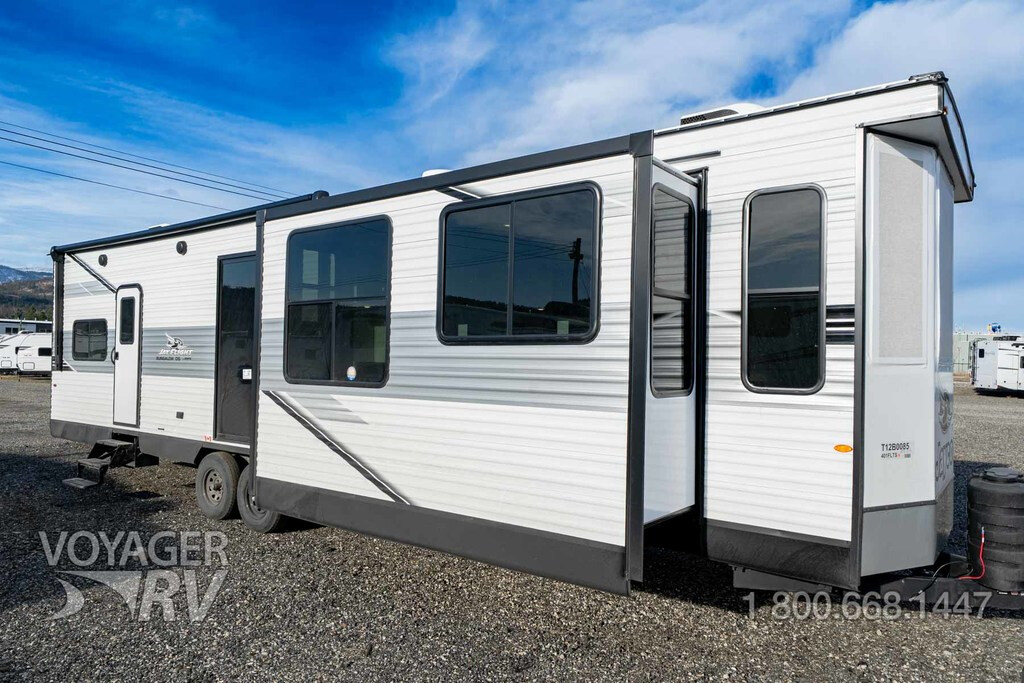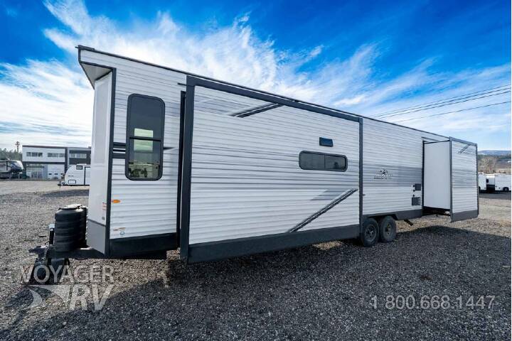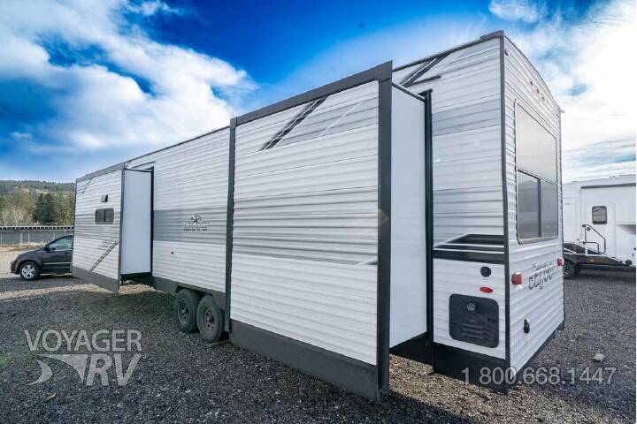 Customer Value Package: G20 dark-tinted privacy windows, Marine-grade exterior speakers, One-piece front fiberglass wall, Oversized side windows, Power awning with LED light, Detachable power cord, (2) 30 lb. propane bottles with cover, 15K BTU A/C, 15K BTU second A/C, Ceiling fan, LED interior and exterior lights, Roller shades in living area, AM/FM/Bluetooth stereo, Bathroom skylight, Power vent in bathroom, Sink cover/cutting board, Shower/tub surround, Thermal Package: insulated and enclosed underbelly.King bedCSA (Canadian Standards)12 in. I-Class cambered structural steel I-beams5/8 in. tongue-and-groove plywood floor deckingAtrium-style front wall with integrated lightsAxles with electric self-adjusting brakes and easy-lube hubsBlack tank flush sprayerElectric powered slideout rooms with enclosed gear systemMagnum Truss roof systemOutside showerPVC roofing membrane (limited lifetime warranty)Radial tires with galvanized-steel, impact-resistant wheel wells82 in. slideout room interior height84 in. tall interior doorways96 in. interior heightAuto-ignition furnace75 lb. full extension ball-bearing drawer guidesCable/satellite prepDecorative dinette ceiling lightElectric fireplace with thermostat controlsElectrical outlets in master bedroom on each side of the bedHardwood-look vinyl flooringHide-a-bed with a tri-fold mattressKitchen power vent with wall controlMedicine cabinet with mirrorOn-demand tankless water heaterPleated shades in bedroomPlywood bed basePorcelain toilet with foot flushResidential refrigeratorResidential-style 24 in. range and 4-burner cooktopResidential-style hidden cabinet door hingesSolid wood cabinet doors throughoutFull PropaneNew BatteryNo Dealer Fees!
