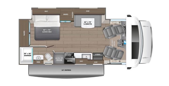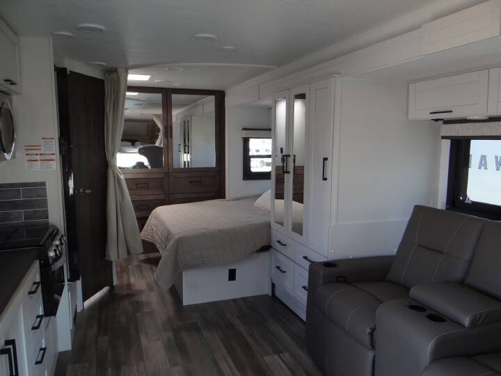 Customer Value Package: JRide, One piece seamless fiberglass front cap, Automotive-bonded panoramic window in front cap w/power shade, Heating holding tanks (12V pads), Electric patio awning with LED lights, Black holding tank sprayer, Infotainment Center w/ Apple Car Play & Android Auto, Backup and side-view cameras, LED HD Smart TV in living area.