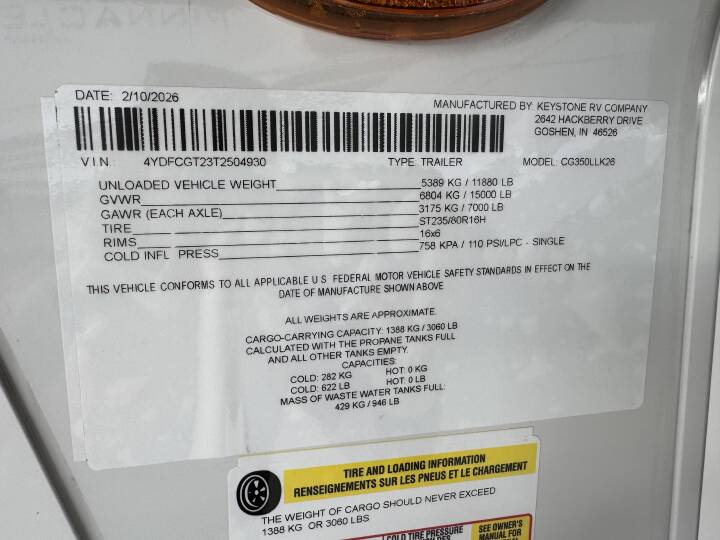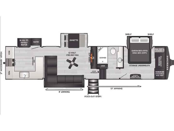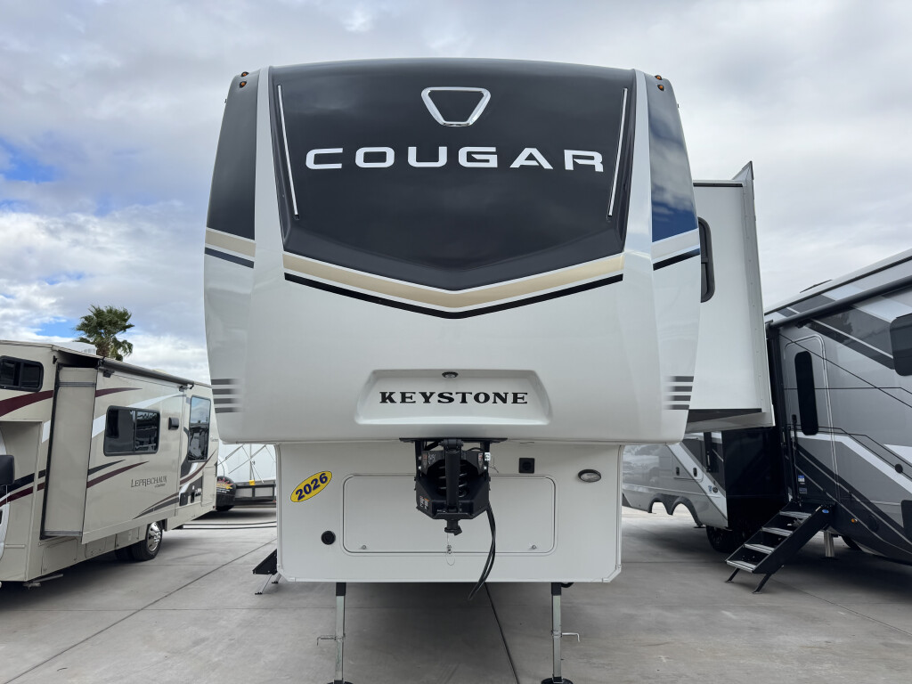 2026 Keystone RV COUGAR 350LLK BASE, KEY FLOOR PLAN ADVANTAGES: -PANORAMIC VIEW OF CAMPSITE FROM KITCHEN AND SOFA -MORE KITCHEN COUNTERSPACE THAT COMPETITORS MODEL -REFRIGERATOR ON THE REAR WALL TAKE A BEATING, NOT OURS! -DISHWASHER PREPPED -LARGEST SECTIONAL SOFA WITH RECLINERS IN MID-PRO -STACKABLE WASHER/DRYER PREPPED - 16 CU FT. 12-VOLT REFRIGERATOR WITH GLASS FRONT -FULL PANTRY -22' OF TOTAL AWNING COVERAGE -EXTERIOR AND INTERIOR SWITCH FOR AWNING OPERATION -BED SLIDEOUT WITH KING BED -14 WINDOWS THROUGHOUT, ALL OPEN -USB/USB-C CHARGING PORTS THROUGHOUT -BEDROOM DRESSOR WITH SLIDING TOP FOR HIDDEN STORAGE KEYSTONE EXCLUSIVE FEATURES: -WATER MANAGEMENT CENTER WITH SHUTOFF VALVES -HYPERCORE COMPOSITE SIDEWALLS -KEY TV ALL "ONE-PIECE" COAX RUNS -GIGGY BOX: 12V DISTRIBUTION BOX -COLOR CODED & UNIFIED WIRING SYSTEM -FLUSH MOUNT HEAT DUCTS -MY KEYSTONE APP FOR OWNERS -SOLAR FLEX PROTECT 220 -TRANSFERRABLE 1-YEAR BASE WARRANTY -TRANSFERRABLE 3-YEAR STRUCTURAL WARRANTY -HIGH GLOSS FIBERGLASS EXTERIOR WHITE FOG COLOR -AIRXCEL ENTR STEPS WITH COMPOSITE TREADS -BRONZE BUSHINGS IN AXLES HANGERS -POWER WATCHDOG SAFEVIEW SMART POWER INLET -SOLID SURFACE BATHROOM VANITY COUNTERTOP -33,000 BTU COOLING- 18K FURRION CHILL CUBE MAIN A/C, 15K FURRION BEDROOM A/C -PREPPED FOR 3RD A/C -H-RATED 16PLY TIRES WITH 8 YEAR WARRANTY -1/2 THICK SHACKLE PLATES WITH GREASEABLE WET BOLTS -ROAD ARMOR SUSPENSION SYSTEM -ABS-ANTI LOCK BRAKING SYSTEM -KEY-ALIKE LOCK SYSTEM -POWER FRESH WATER TANK FILL -OXYGENICS SHOWER HEAD -RESCESSED INTERIOR LIGHTING -DIMMABLE LIGHTING THROUGHOUT -SNAP-IN CEILING BATTENS, SNAP-IN CROWN MOLDING -TANKLESS WATER HEATER -CLIMATE GUARD-TESTED & APPROVED FROM 0 TO 110 DEGREES -12 VOLT HEAT PADS ON TANKS -HEAT, LIGHT, AND MASSAGE INTHEATER SEATS -WINEGARD AIR 360 + ANTENNA WITH ROOF SATELLITE PREP -SOFT CLOSE CABINETS DOORS AND HIDDEN HINGES -12-VOLT REFRIGERATOR -ROLLER SHADES THROUGHOUT -50 AMP SERVICE -AUTO-LEVELING, 4 -POINT LIPPERT GROUND CONTROL OPTIONS: FREE STANDING DINETTE WITH OTTOMAN 2ND POWER AWNING REFRIGERATOR 12V-16CF 2ND 15KA/C SOLAR FLEX DISCOVER KING BED