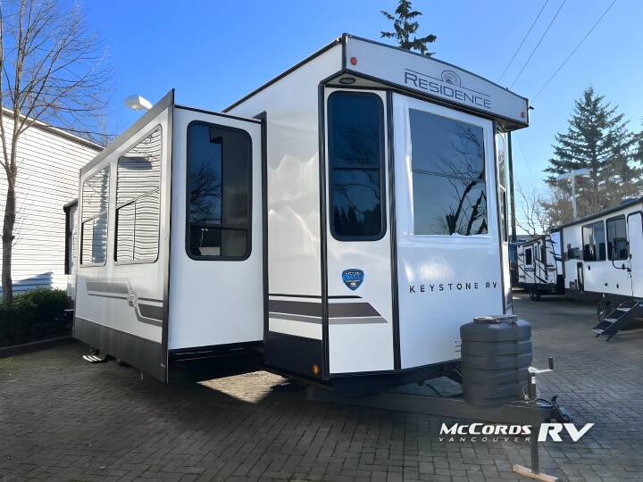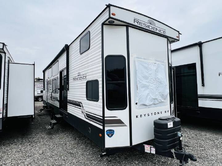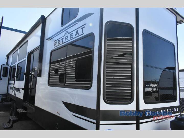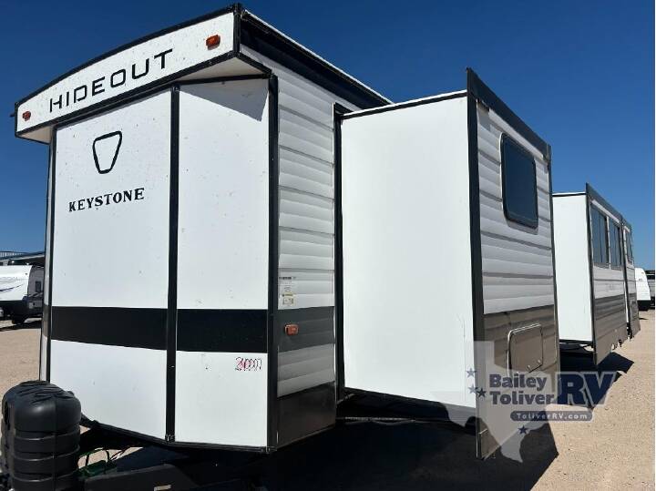 Extended stays are easy in this spacious destination trailer. Since there are two private bedrooms and two full baths, you can camp with family and friends, plus there are triple slides for more space! The front bedroom includes a king bed slide out, a closet, dresser, plus washer and dryer prep if you choose to add those appliances. The master bedroom towards the back features a queen bed slide, dual closets, and a full rear bath, and both bathrooms includes a shower with a seat for more comfort! Everyone can meet in the combined kitchen and living area to relax on the tri-fold sofa, play a game at the flex lounge, or just enjoy the 50" TV and fireplace. And the full kitchen is sure to impress with its three burner gas oven, air fryer microwave, and 16 cu. ft. refrigerator! The Keystone Hideout destination trailers will be just what the doctor ordered for a stress-free holiday at your favorite campsite! There are a few exclusive features that you'll only find on a Keystone product, like the color-coded unified wiring, the Tuf-Lok thermoplastic duct joiners, the in-floor heating ducts, and the Tru-fit slide construction. Each model has a power awning for some shade in the afternoon, and the tinted safety glass windows will prevent the harmful UV rays from getting inside. You'll also have blackout night shades that you can close when you want privacy and one-piece pressed countertops that will be easy to keep clean.