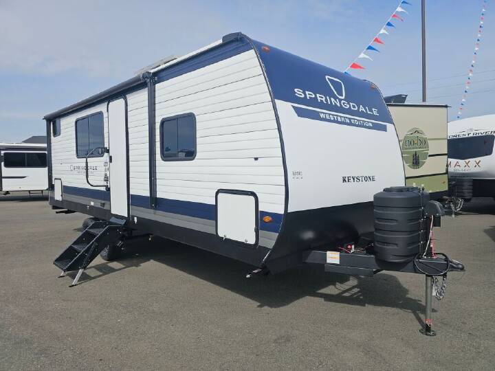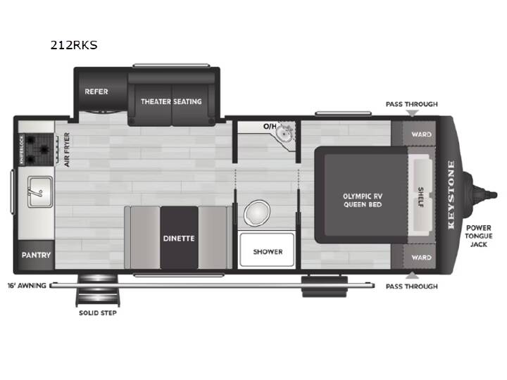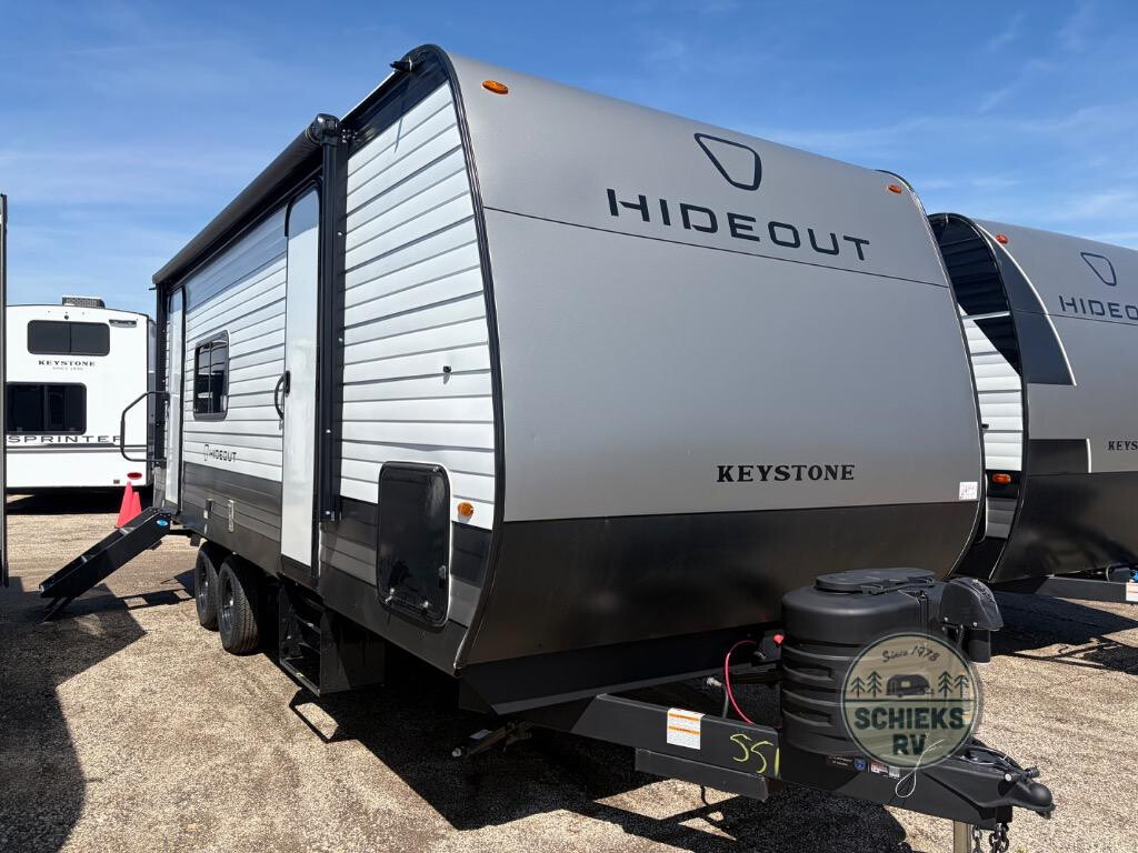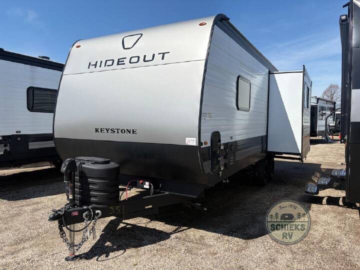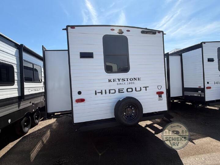 This travel trailer offers a comfortable layout! The rear kitchen is a chef's dream, featuring a three-burner stove, pantry, sink, and fridge - prep meals with ease. The booth dinette is perfect for dining, and the theater seating is ideal for relaxing. The walk-through bathroom is a plus, leading to the front bedroom with an Olympic RV queen bed and plenty of wardrobe space. And with double entry doors, getting in and out is a breeze. Perfect for couples or small families looking for a cozy getaway! With any Hideout travel trailer by Keystone, you will find functional features and comfort at every turn! Each one is built with Tru-fit slide construction and a walkable roof for added durability. There is One piece enclosed underbelly, along with an outside shower, heavy-duty stabilizer jacks, and Furrion® backup camera prep. You'll love the pressed countertops inside, plus, LED lighting, blackout night shades, and many more comforts. Additional features include a tankless water heater, a black tank flush, a power tongue jack, and an XL entry assist handle to name just a few!