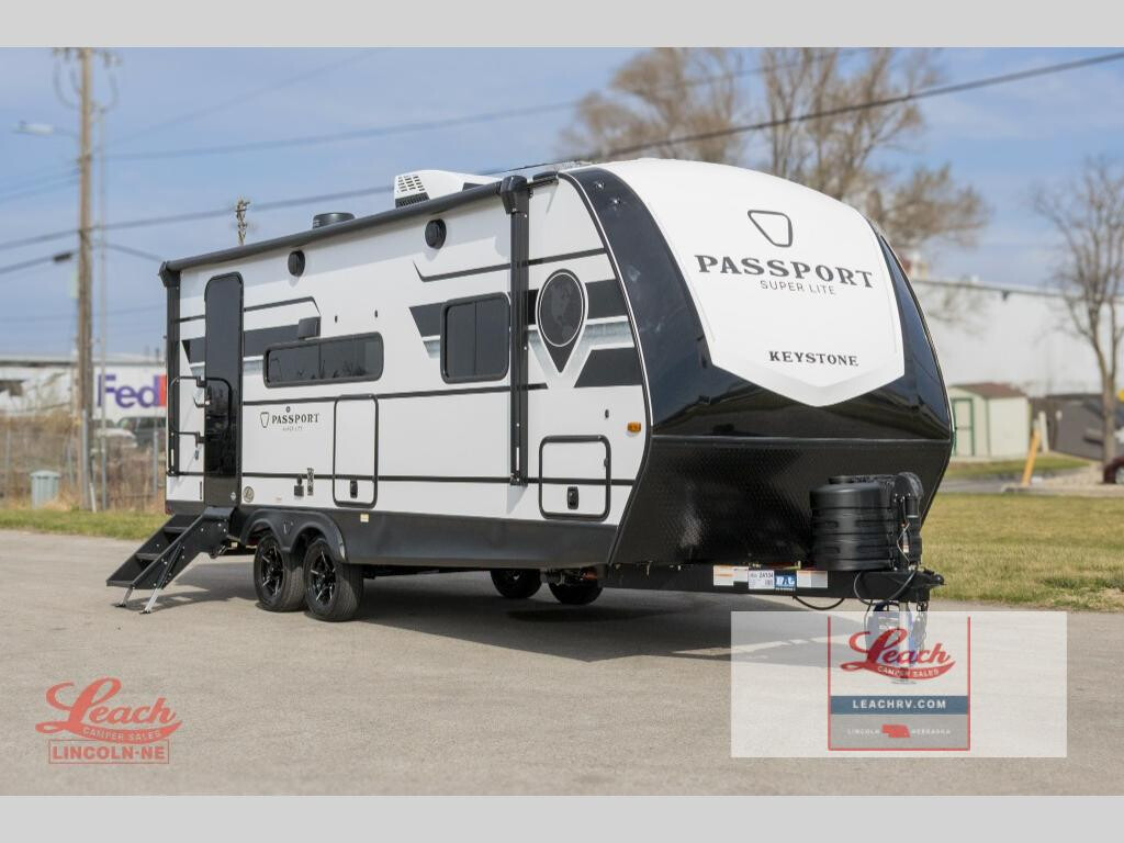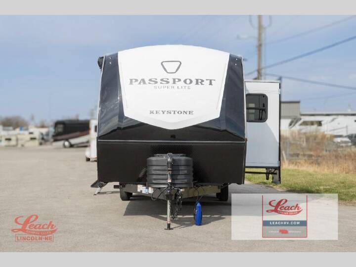 Camping trips are made complete in this spacious travel trailer for two happy campers. There is a front queen bed with dual bedside wardrobes to keep your things tidy, and you can easily clean up in the rear corner full bath before starting your day. The cooktop inside will let you make breakfast, or you can head outdoors to use the exterior griddle and small refrigerator. Back inside, there is a bar top with two stools for seating space, along with luxury style cinema theater seating within the slide out. This unit also includes a hidden pocket pantry in the kitchen, along with a second pantry, storage cubbies, and an exterior pass-thru storage so nothing gets left behind! With any Keystone Passport Super Lite travel trailer you will enjoy lightweight towing and lots of interior comforts! The power tongue jack lets you hitch up at the drop of a hat, and the Dexter torsion axle rubber ride suspension will make towing easier than ever. You will appreciate having 4-point power stabilizer jacks for quick setup and an exterior convenience center to monitor tank levels. These trailers feature 5-sided aluminum construction, new premium aluminum wheels, a heated and enclosed underbelly, plus new composite solid entry steps. Inside, you'll enjoy seamless kitchen countertops, interior lights with a dimmer, a rainfall showerhead, and premium pull-down roller shades for added privacy. CEDAR FROST DECOR; UPGRADED EQUIPMENT PACKAGE; SOLAR FLEX PROTECT; THEATRE SEATING; REFRIGERATOR -12V- 10CF; 15K AIR CONDITIONER; NEBRASKA STATE SEAL; RVIA SEAL -GO CAMPING; PICTURES SHOWN MAY NOT BE ACTUAL INCLUDED OPTIONS; CONTACT SALES PERSON FOR DETAILS