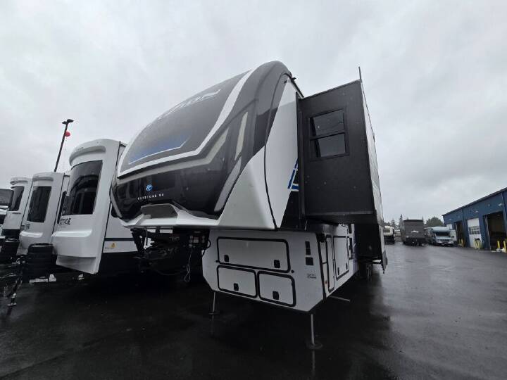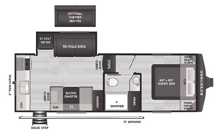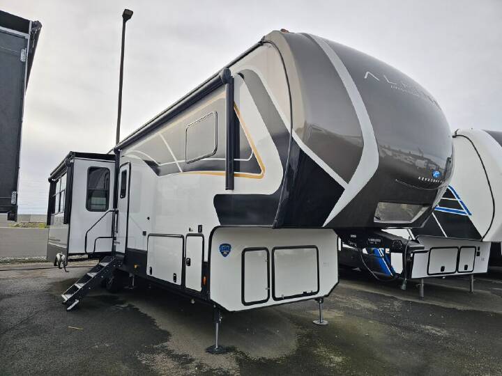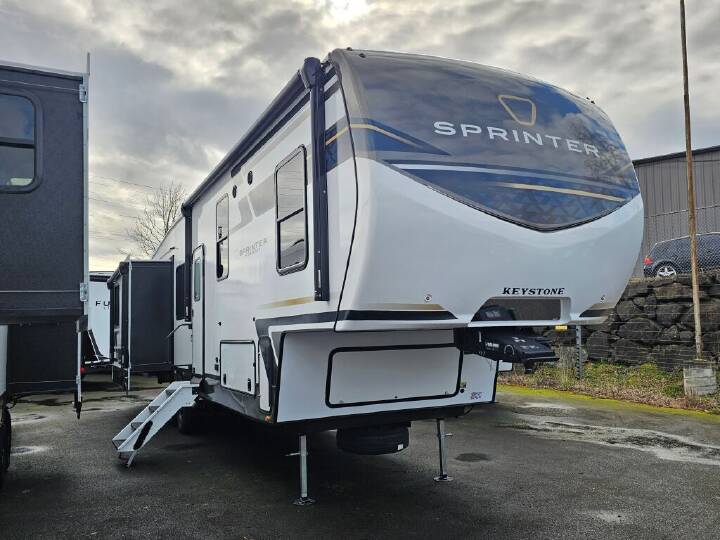 Pack your bags and head to your favorite state park in this four slide out fifth wheel. Up front, the bunkhouse suite includes two bunk beds, a desk, a slide out with a TV hookup, and a half bath for convenience. You'll have the master bedroom all to yourselves with a king bed slide out, plenty of storage, and a full rear bath with dual bath sinks so you both can get ready for bed at once. The chef of your group can make meals on the three burner gas range or in the stainless steel microwave, and food can be stored in the 12V refrigerator and pantry. A booth dinette provides a place to dine, or you can choose the optional free-standing dinette. And the full reclining theater seating across from the fireplace and 50" TV will make movie night cozy! The Sprinter fifth wheels by Keystone feature spacious living areas, plenty of storage, and outstanding towability. Each unit is constructed with 2" aluminum framed and laminated sidewalls, a fully walkable roof, and dual layer insulation to help extend your camping season. The heated pass-through storage includes lockable slam latch baggage doors so you can easily pack your gear, and the one-touch 4-point leveling system features return hookup memory to have you set up in no-time. Head inside to find Congoleum vinyl flooring, Thomas Payne luxury collection furniture, residential style seamless marbled countertops, and an upgraded bedspread to name a few comforts. The Sprinter also includes a Girard tankless on-demand water heater, a central command center, plus a 30k BTU furnace and two A/C units to ensure your comfort! INCLUDES - FTRV QUALITY ASSURANCE / CAMP READY PKG; INCLUDES - DEALER PREP; NO HIDDEN FEES; COMFORT PACKAGE; CAMPING MADE EASY PACKAGE; LUXURY PACKAGE; SOLAR FLEX PROTECT; ELECTRIC 4 POINT LEVELING SYSTEM; REFRIGERATOR 12V 16 CF; WASHER/DRYER PREP; KING BED; MAXX AIR RAINSENSOR VENT; THEATER SEATING; 13 5K 3RD A/C; FREE STANDING DINETTE AND CHAIRS