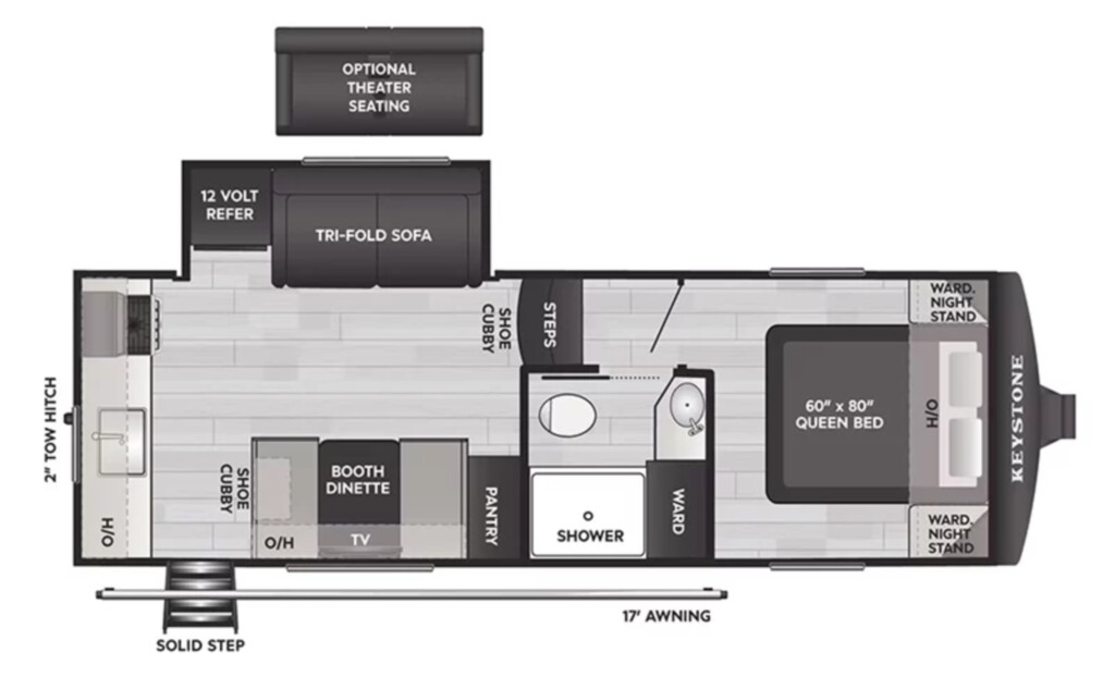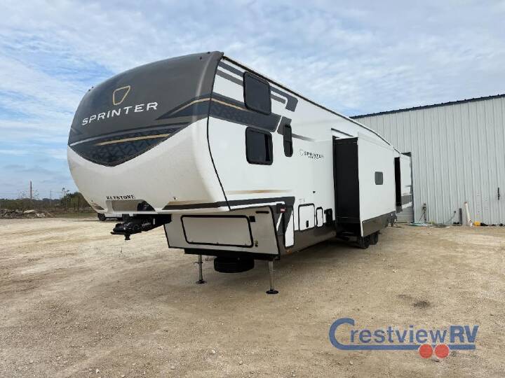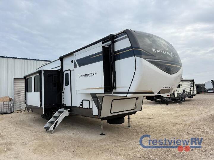 Pack your bags and head to your favorite state park in this four slide out fifth wheel. Up front, the bunkhouse suite includes two bunk beds, a desk, a slide out with a TV hookup, and a half bath for convenience. You'll have the master bedroom all to yourselves with a king bed slide out, plenty of storage, and a full rear bath with dual bath sinks so you both can get ready for bed at once. The chef of your group can make meals on the three burner gas range or in the stainless steel microwave, and food can be stored in the 12V refrigerator and pantry. A booth dinette provides a place to dine, or you can choose the optional free-standing dinette. And the full reclining theater seating across from the fireplace and 50" TV will make movie night cozy! The Sprinter fifth wheels by Keystone feature spacious living areas, plenty of storage, and outstanding towability. Each unit is constructed with 2" aluminum framed and laminated sidewalls, a fully walkable roof, and dual layer insulation to help extend your camping season. The heated pass-through storage includes lockable slam latch baggage doors so you can easily pack your gear, and the one-touch 4-point leveling system features return hookup memory to have you set up in no-time. Head inside to find Congoleum vinyl flooring, Thomas Payne luxury collection furniture, residential style seamless marbled countertops, and an upgraded bedspread to name a few comforts. The Sprinter also includes a Girard tankless on-demand water heater, a central command center, plus a 30k BTU furnace and two A/C units to ensure your comfort! COMFORT PKG; CAMPING MADE EASY PKG; LUXURY PKG; WASHER/DRYER PREP; ELECTRIC 4 POINT LEVELING SYSTEM; 13.5K 3RD AC; KING BED; THEATHER SEATING; MAXX AIR RAINSENSOR VENT; REFRIGERATOR-12V-16CF; SOLAR FLEX PROTECT; FREE STANDING DINETTE & CHAIRS; RVIA SEAL-GO CAMPING