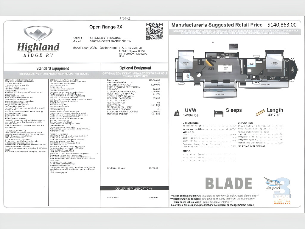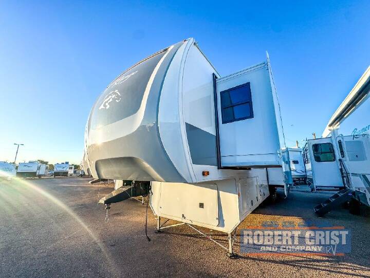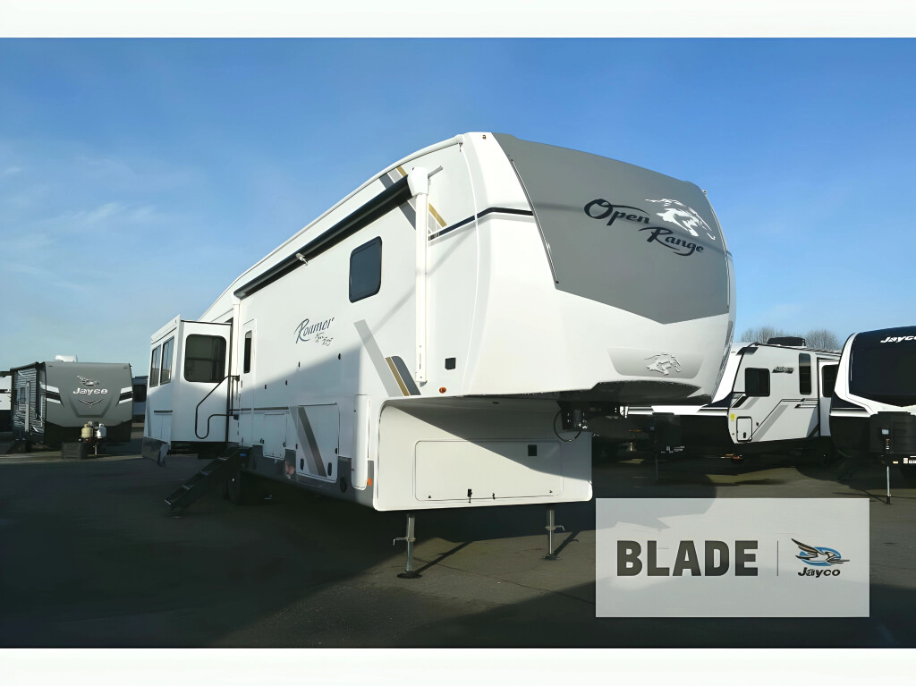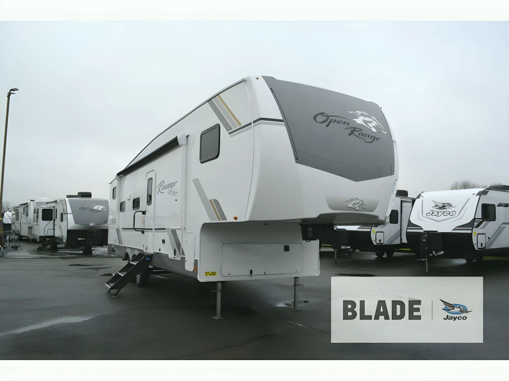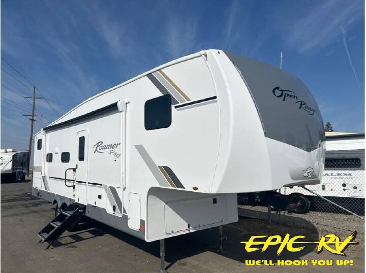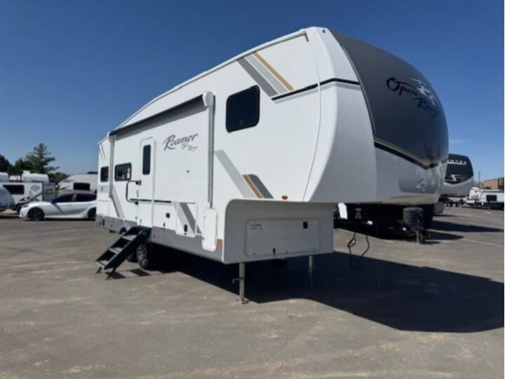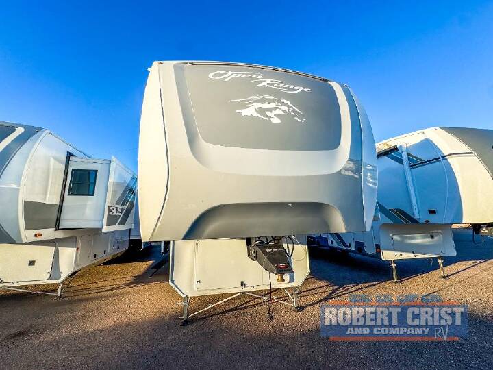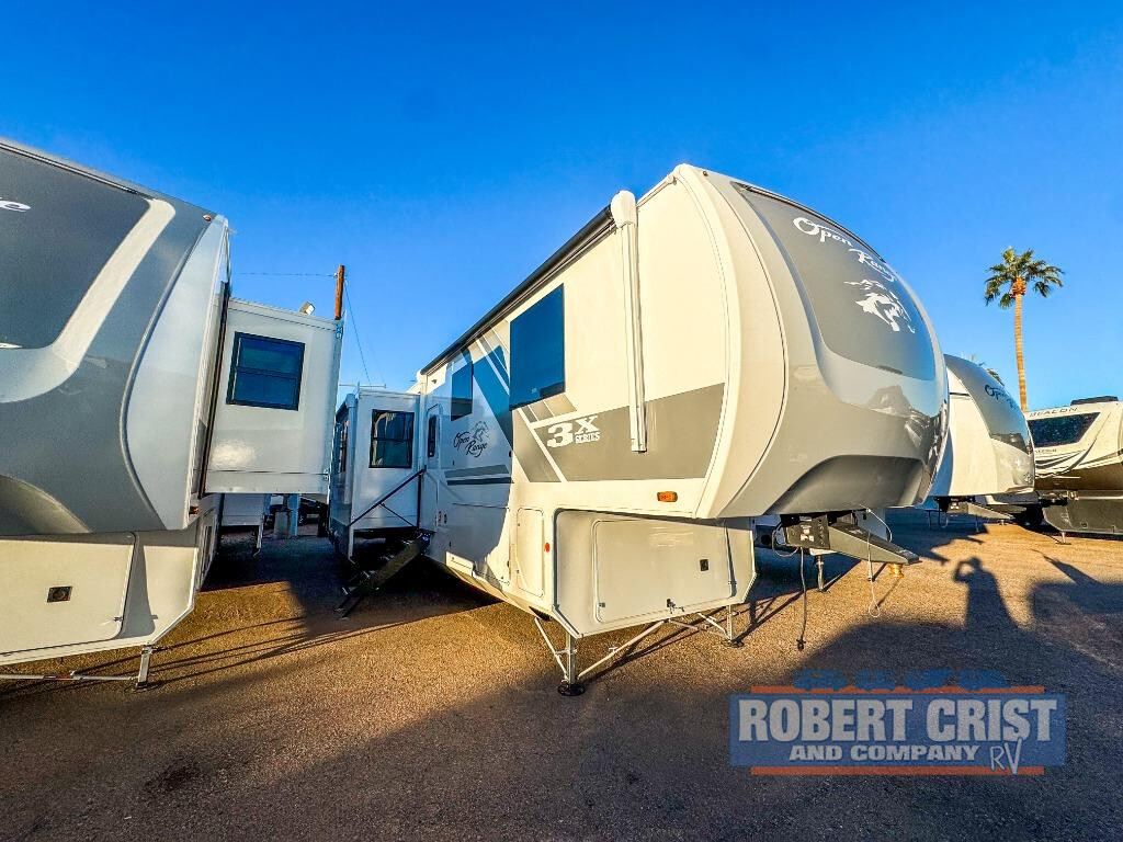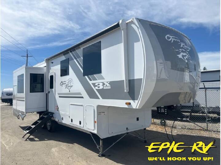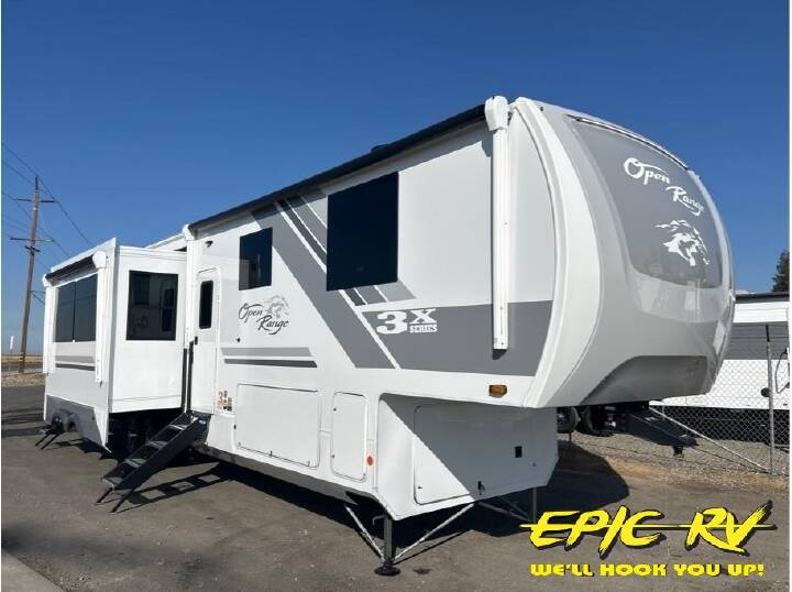 If you enjoy luxury camping or you're looking for a residential fifth wheel to go full-time in, this Open Range 3X is the one! The middle kitchen and living room is made open by the dual opposing slides, and your crew can get comfortable on the mega lounge with two tables. The chef of your group will love cooking on GE free-standing four burner range, or they can use the GE residential microwave to heat up leftovers. The standard dishwasher and central vacuum make cleanup a breeze. A waterfall island with four chairs will provide a place to dine and the hidden pantry behind the swing-out entertainment center can hold snacks galore. There is also a fireplace and smart HDTV to make movie nights cozy. The front master bedroom includes a slide out 72" x 78" king bed, two dressers, a large front closet, and a 32" TV to watch shows in bed. You even have your own entrance into the full bath, plus washer and dryer prep if you choose to add those appliances. The rear bunkhouse suite includes two separate sides that can be shut off from one another, perfect if you have older kids or more than one guest. Each side includes a bi-fold sofa, a desk with overhead storage, and a wardrobe with drawers. And one side even includes a flip-up bunk above the sofa for more sleeping space! The shared full rear bath includes a tub/shower to make bath time easier than ever, plus you'll find one of the dual entry doors here for added convenience! With any Open Range 3X fifth wheel by Open Range RV, you will enjoy residential luxuries and an exceptional build. The TuffShell construction includes vacuum bonded laminated fiberglass and welded aluminum frames for added strength, and the PVC roofing membrane is ultra durable. You can plan to camp year around or go full-time since there is a mandatory Four Season Package that includes a heated and enclosed underbelly, a 40K BTU high-performance furnace, double insulated baggage doors, and more. The residential features continue on with the mandatory Executive Package with the TravelLINK Smart RV system, Keyed-Alike entry and baggage doors, painted fiberglass front cap with LED lighting, and three 15,000 BTU A/C units with quiet residential return air. Inside, you'll enjoy GE kitchen appliances, sleek square windows with integrated blinds, ceramic subway tile backsplash, a glass shower door, and the list of amenities goes on! OPTIONS