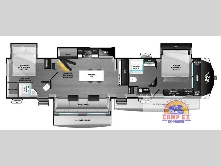 If you enjoy luxury camping or you're looking for a residential fifth wheel to go full-time in, this Open Range 3X is the one! The middle kitchen and living room is made open by the dual opposing slides, and your crew can get comfortable on the mega lounge with two tables. The chef of your group will love cooking on GE free-standing four burner range, or they can use the GE residential microwave to heat up leftovers. The standard dishwasher and central vacuum make cleanup a breeze. A waterfall island with four chairs will provide a place to dine and the hidden pantry behind the swing-out entertainment center can hold snacks galore. There is also a fireplace and smart HDTV to make movie nights cozy. The front master bedroom includes a slide out king bed with a power tilt, two dressers, a large front closet, and a 32" TV to watch shows in bed. You even have your own entrance into the full bath, plus washer and dryer prep if you choose to add those appliances. The rear master bedroom is just as accommodating with a queen bed slide out, a wardrobe and a dresser, plus a second full bath with its own exterior entry door. And the loft above the rear bedroom provides even more sleeping space. With any Open Range 3X fifth wheel by Open Range RV, you will enjoy residential luxuries and an exceptional build. The TuffShell construction includes vacuum bonded laminated fiberglass and welded aluminum frames for added strength, and the PVC roofing membrane is ultra durable. You can plan to camp year around or go full-time since there is a mandatory Four Season Package that includes a heated and enclosed underbelly, a 40K BTU high-performance furnace, double insulated baggage doors, and more. The residential features continue on with the mandatory Executive Package with the TravelLINK Smart RV system, Keyed-Alike entry and baggage doors, painted fiberglass front cap with LED lighting, and three 15,000 BTU A/C units with quiet residential return air. Inside, you'll enjoy GE kitchen appliances, sleek square windows with integrated blinds, ceramic subway tile backsplash, a glass shower door, and the list of amenities goes on!