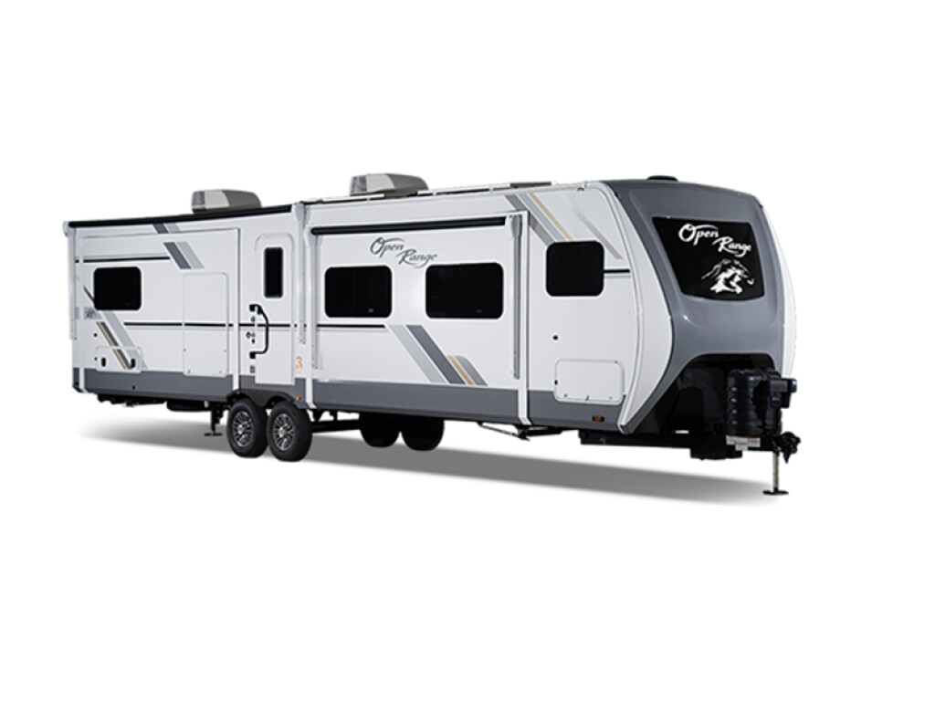 This Open Range travel trailer offers fantastic flexibility! The private rear bedroom with a king bed is a lovely retreat, while your guests or children enjoy the middle room with a bunk and desk below. The common living area is an open space with a mega lounge with two pedestal tables, plus a U-dinette for even more seating! The frameless windows provide the perfect view! A full bath is easily accessible, and the kitchen offers a full suite of appliances plus an island for convenient work space. Outside is a second kitchen with fridge and pull-out griddle for even more fun! With any Open Range RV Open Range travel trailer, the 100" wide body frame and the ACCU-SLIDE slide system with 42" deep 4-corner compression offer more interior space. Inside, you will also enjoy residential vinyl flooring, raised panel hardwood doors, and two air conditioners with quiet residential return air. The exterior equipment includes Equa-Flex axle suspension, self-adjusting electric brakes, and the Norco 5.1 stabilizer system with BAL lock arms. You will also enjoy the Four Season package that offers ducted heat to underbelly with cold air return, an enclosed exterior docking station, a heated and enclosed underbelly, and a high-performance furnace to mention a few highlights.