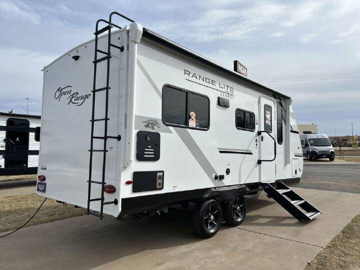 Time at the campground will be time well spent in this spacious couple's trailer! There is a front jack-knife sofa with a table under the sofa where you can dine together. In the evening, just fold down the Murphy bed and you've got an instant cozy bed! Once you've made breakfast on the three-burner cooktop or in the microwave, you can relax on the theater seat slide out with your coffee. The full bath includes a 30" x 36" shower, a vanity and toilet, plus a linen closet and medicine cabinet so everything has a place. Outside, you'll find storage for your hiking gear, a patio awning, and an LP quick connect in case you want to bring along your portable grill! With any Range Lite travel trailer by Open Range RV, you will enjoy comfort and convenience at every turn! Each one is built with vacuum bonded sidewalls with interior and exterior Azdel, a 2" TuffShell floor, and front diamond plating to help protect against rock and debris on the way to the campground. The Xtend l Solar Package includes a 200-watt solar panel with a 30-amp solar controller for off-grid capabilities, and you're sure to appreciate the tankless water heater onboard for endless hot showers. Head inside to enjoy residential cabinetry with large doors and drawers, roller shades with radiant barrier backer, Invision kitchen appliance package, and many more comforts! Choose the optional Legacy Package for a molded front cap, 5-point power stabilization system, solid surface countertops, and more optional features to further customize your travel trailer!