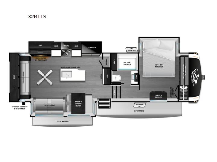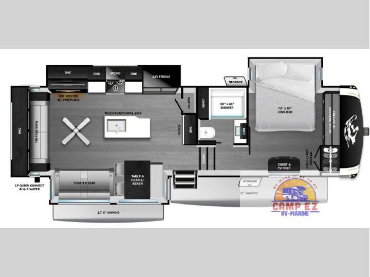 The perfect fifth wheel is found with this Roamer! Once you arrive at the campsite, you can put out the two power awnings and relax in your camp chairs. There are plenty of comfortable seating spaces in the rear living area, including a tri-fold sofa, theater seat, plus a table and chairs with a bench. The kitchen island provides extra counter space, along with a multi-functional sink, and you'll love having a pantry, hutch, and Hi Sense 12V black glass refrigerator for storage. The owners will enjoy their own space up front in the private bedroom, complete with a king bed slide, a closet with shelves and drawers below, a storage chest, plus washer and dryer prep! For the perfect balance of strength, comfort, and efficiency, take a look at the Roamer fifth wheels by Open Range RV! Each one features TuffShell vacuum bonded laminated construction, an automotive style front cap with max turn radius, and an Alpa Ply TPO roof membrane, the thickest in the industry! You will also appreciate the Cool Force System and Thermal Seal zero-degree tested weather protection to help you extend your camping season. And the mandatory Traveling Package with a MORryde CRE-3000 rubberized suspension, Dexter Axles, and E-Z Lube hubs will make towing easier than ever. You'll be met with residential features inside, including a glass shower door, solid surface countertop(s), 100% no floor heat vents, and residential vinyl flooring throughout!
