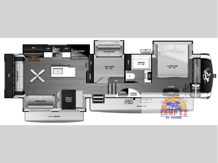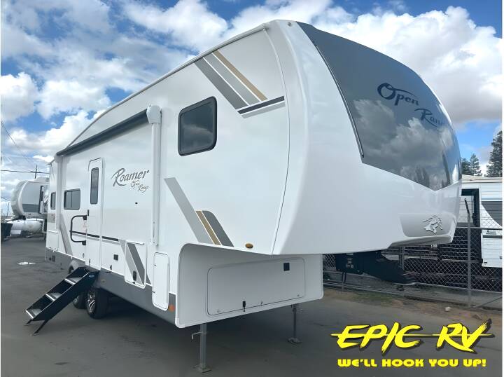 The perfect family-friendly fifth wheel is found with this Roamer! Once you arrive at the campsite, you can put out the two power awnings, then make lunch on the outside kitchen. There are plenty of comfortable seating spaces in the rear living area, including a tri-fold sofa, theater seat, plus table and chairs with a bench. The kitchen island provides extra counter space, along with a multi-functional sink, and you'll love having a pantry, hutch, and Hi Sense 12V black glass refrigerator for storage. The middle den includes a tri-fold sofa and a desk, perfect for a guest bedroom or office, plus there is a loft above for extra sleeping or storage space! And the owners will enjoy their own space up front in the private bedroom, complete with an Olympic queen bed, a closet with shelves and drawers below, a storage chest, plus washer and dryer prep! For the perfect balance of strength, comfort, and efficiency, take a look at the Roamer fifth wheels by Open Range RV! Each one features TuffShell vacuum bonded laminated construction, an automotive style front cap with max turn radius, and an Alpa Ply TPO roof membrane, the thickest in the industry! You will also appreciate the Cool Force System and Thermal Seal zero-degree tested weather protection to help you extend your camping season. And the mandatory Traveling Package with a MORryde CRE-3000 rubberized suspension, Dexter Axles, and E-Z Lube hubs will make towing easier than ever. You'll be met with residential features inside, including a glass shower door, solid surface countertop(s), 100% no floor heat vents, and residential vinyl flooring throughout!