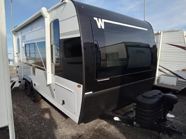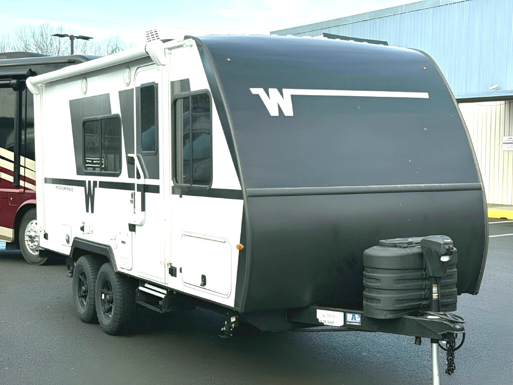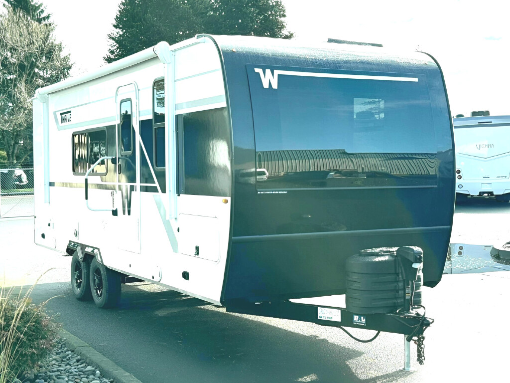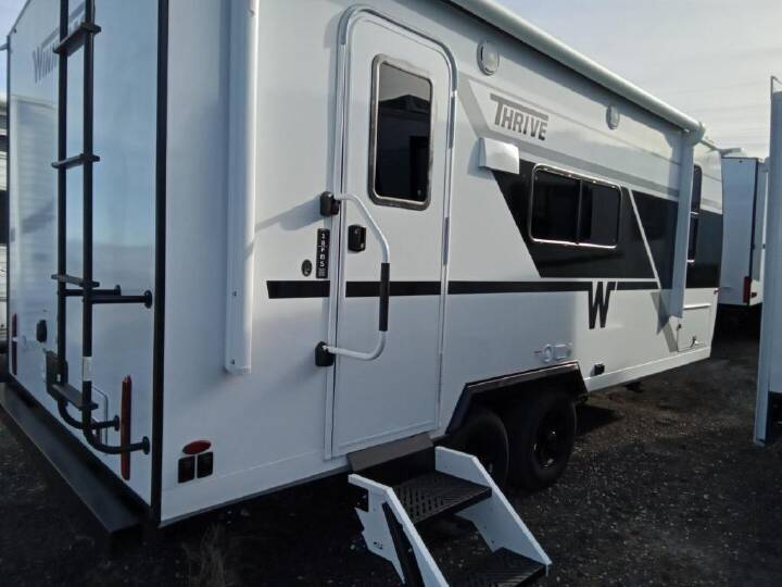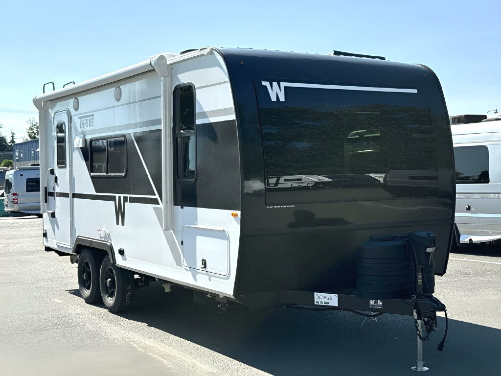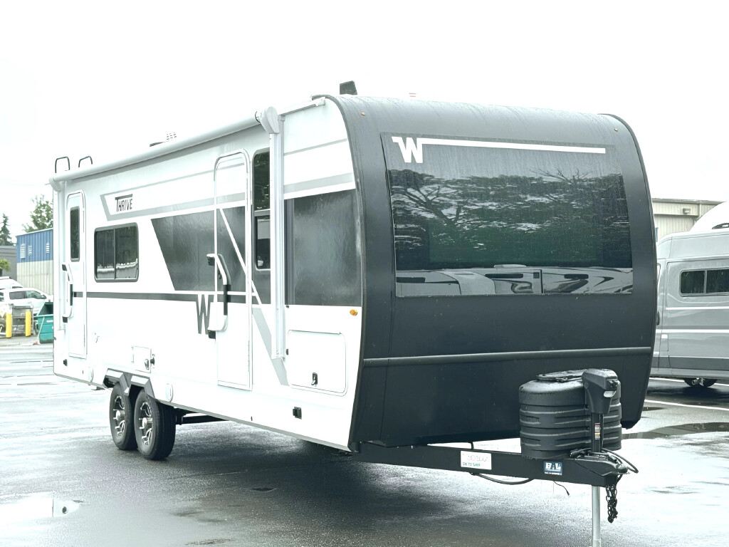 It will be so easy to enjoy camping trips in this compact travel trailer. The jack knife sofa slide provides more floor space plus a place for an overnight guest to sleep. You'll find an Olympic queen bed up front with a privacy curtain and dual bedroom wardrobes to keep your things tidy. A recessed three burner cooktop with an oven will let you make meals each day, and the 10.6 cu. ft. 12V refrigerator will keep your cold items fresh. There is also a pantry with pull-out shelves for added storage space. The full bath includes a power vent fan and a shower skylight that will give you more lighting and extra head room as you get ready each day! With any Thrive travel trailer by Winnebago, you can camp with functionality, comfort, and convenience! The large front viewing window will be the first thing that catches your eye, and the fiberglass sidewalls with Azdel Onboard provide a durable trailer made to last. There is also an exterior ladder, along with front radius profile lights, power stabilizer jacks, and a powered awning with LED lighting to name a few exterior features. You will stay powered up by the 30-amp power cord and 200-watt solar panel, plus there is a tankless water heater for endless hot showers. Inside, you'll love the custom Winnebago furniture, carpetless side outs, molded fiberglass countertops, and residential recessed ceiling lights to keep your space well lit!